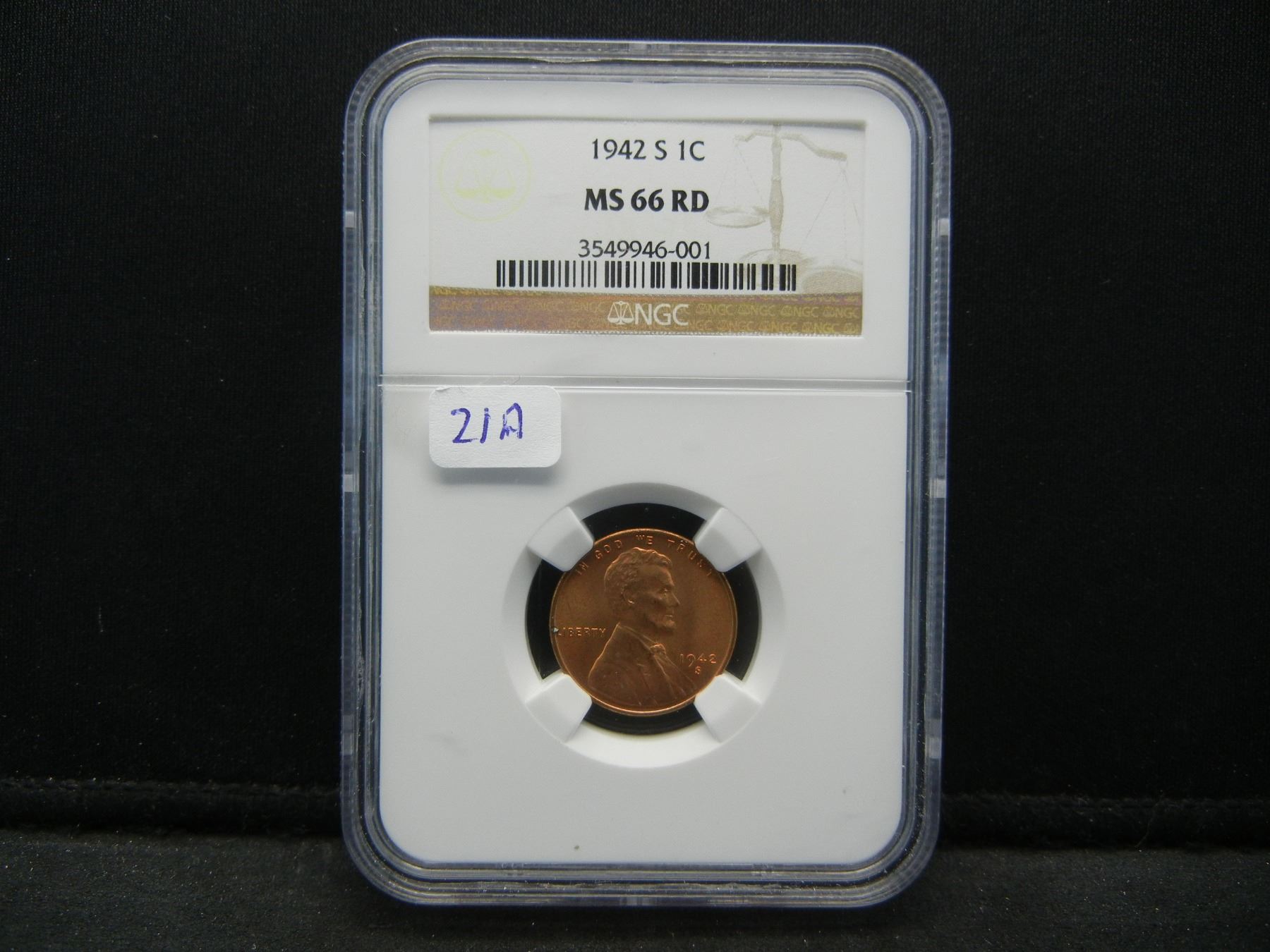 1942-S Lincoln Wheat Cent. Slabbed by NGC as MS 66 Red