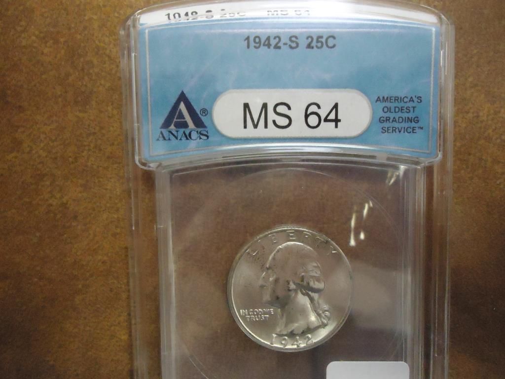 1942-S WASHINGTON SILVER QUARTER ANACS MS64