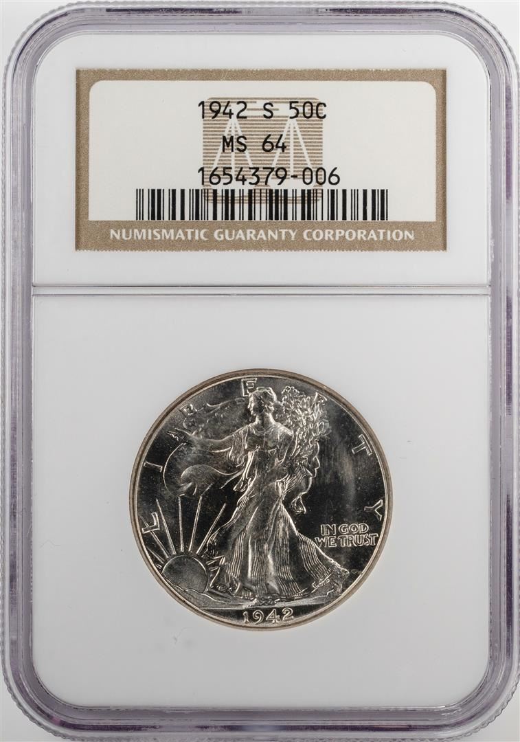 One 1942-S Walking Liberty Half Dollar Coin NGC MS64. NGC Certified.