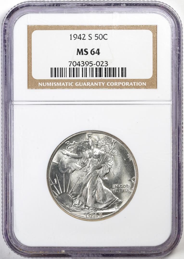 One 1942-S Walking Liberty Half Dollar Coin NGC MS64. NGC Certified.