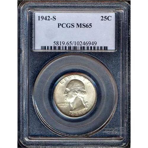 <b>1942-S Washington Quarter Dollar. PCGS graded MS65.</b> Bold fresh white surfaces and a sharp strike. Clearly at the top of its gem designation <b>(PCGS # 5819)</b> <i>