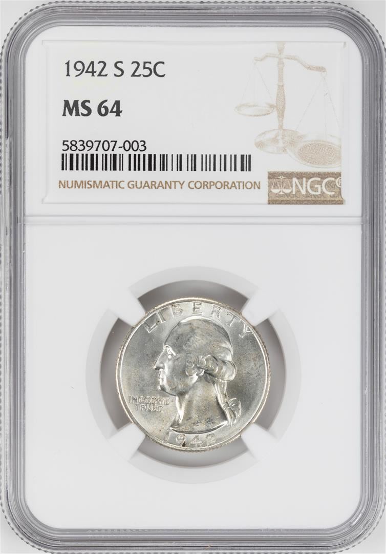 One 1942-S Washington Quarter Coin NGC MS64. NGC Certified.