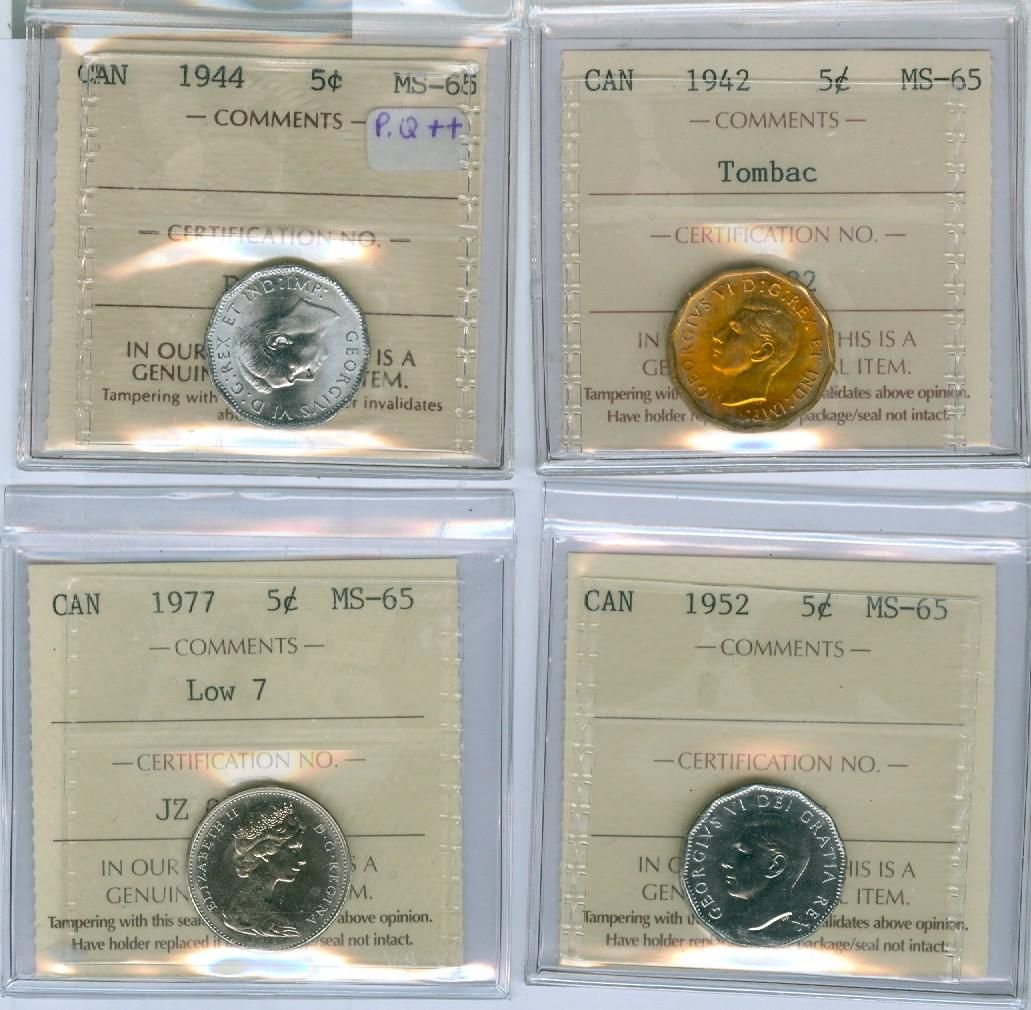 1942 Tom, 1944, 1952 & 1977 low 5¢ ICCS MS65.