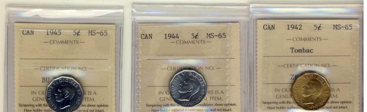 1942 Tombac 5¢, 1944 & 1945 ICCS MS65. Lot of 3 coins.