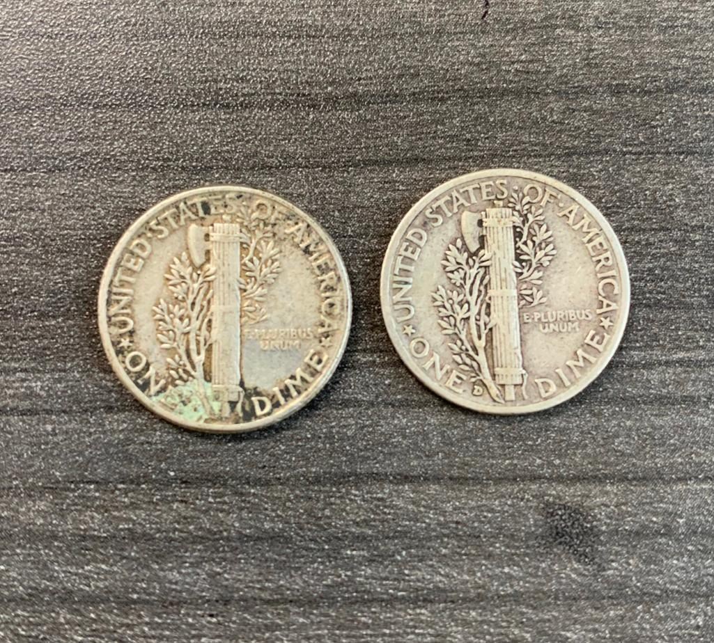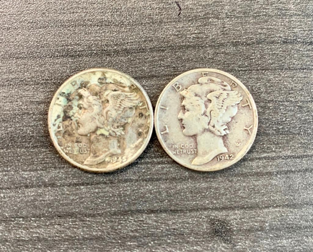 Obverse An allegory of Liberty wearing a winged Phrygian cap (freedom of thought) is surrounded with the word "LIBERTY" and accompanied with the motto: "IN GOD WE TRUST" Lettering: LIBERTY IN GOD WE TRUST 1942 AAW Engraver: Adolph Alexander Weinman Reverse Mintmark to right of ONE A fasces mixed with an olive branch shows both that the United States is prepared for the war and its desire for peace. It is accompanied with the motto "E • PLURIBUS UNUM" and surrounded with the face value and the lettering "UNITED • STATES • OF • AMERICA" Lettering: E • PLURIBUS UNUM UNITED • STATES • OF • AMERICA * ONE DIME * D Engraver: Adolph Alexander Weinman Edge Reeded (118 reeds) Specifications Country: United States Type: Standard circulation coin Years: 1916-1945 Value: 10 Cents = 1 Dime 0.1 USD = 0.13 CAD Currency: Dollar (1785-date) Composition: Silver (.900) Weight: 2.5 g Diameter: 17.9 mm Thickness: 1 mm Shape :Round