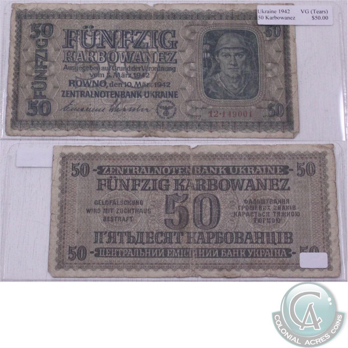 1942 Ukraine 50 Karbowanez Note in Very Good Condition, Please note that there are small tears around the perimeter of the bill.