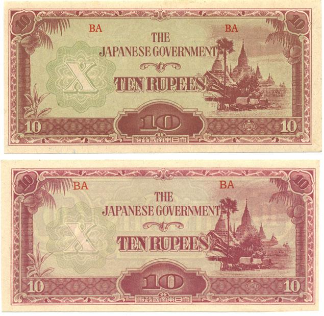 Scarce pair of Burma Japanese invasion money 10 Rupees; both varieties large and small block numbers; crisp uncirculated condition; WW2 antique