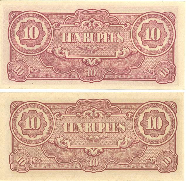 Scarce pair of Burma Japanese invasion money 10 Rupees; both varieties large and small block numbers; crisp uncirculated condition; WW2 antique