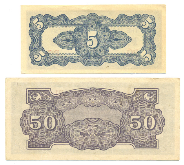 Scarce pair of Philippines Japanese invasion money 5 & 50 centavos; crisp circulated to crisp uncirculated condition; WW2 antique