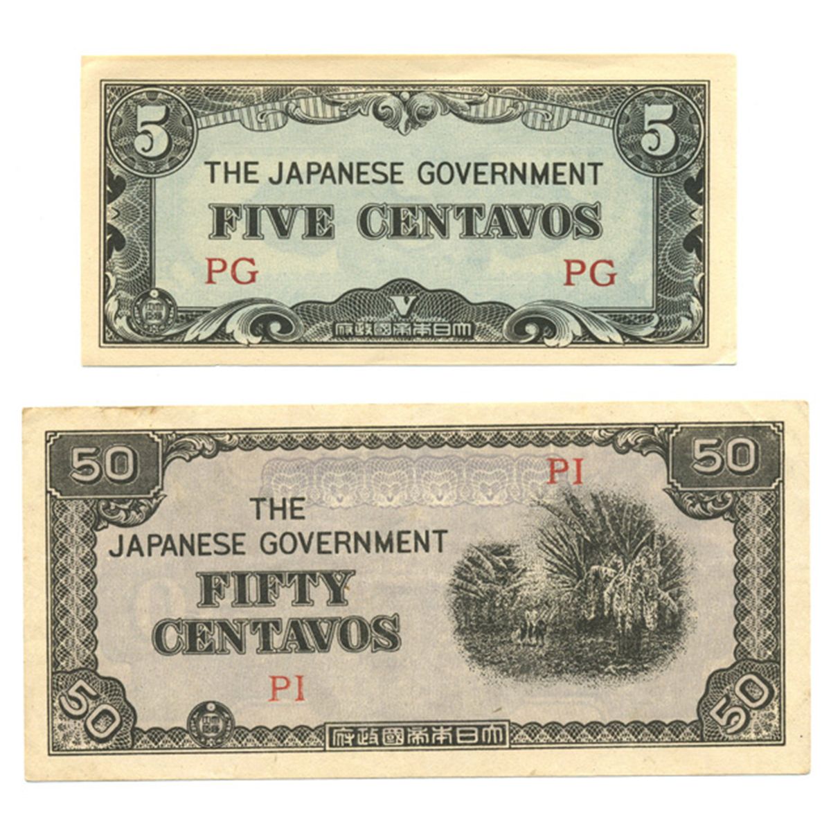 Scarce pair of Philippines Japanese invasion money 5 & 50 centavos; crisp circulated to crisp uncirculated condition; WW2 antique