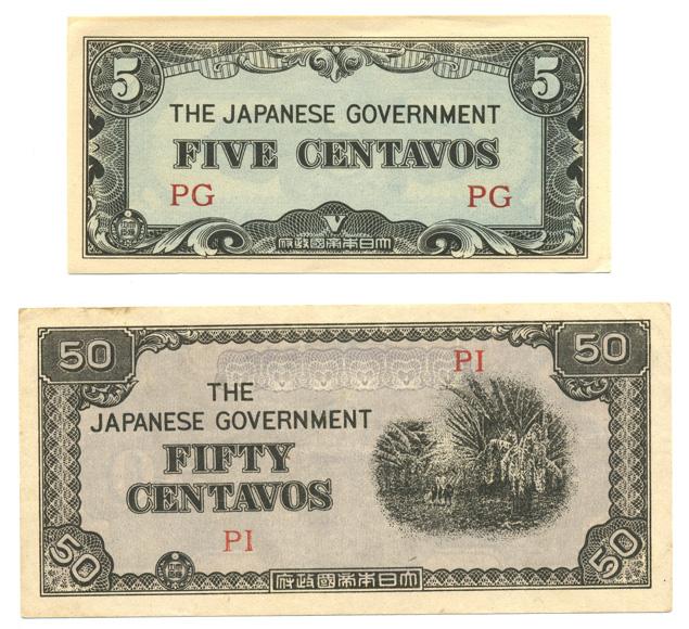 Scarce pair of Philippines Japanese invasion money 5 & 50 centavos; crisp circulated to crisp uncirculated condition; WW2 antique