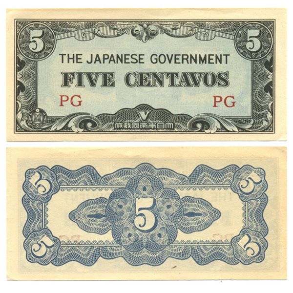Scarce pair of Philippines Japanese invasion money 5 & 50 centavos; crisp circulated to crisp uncirculated condition; WW2 antique