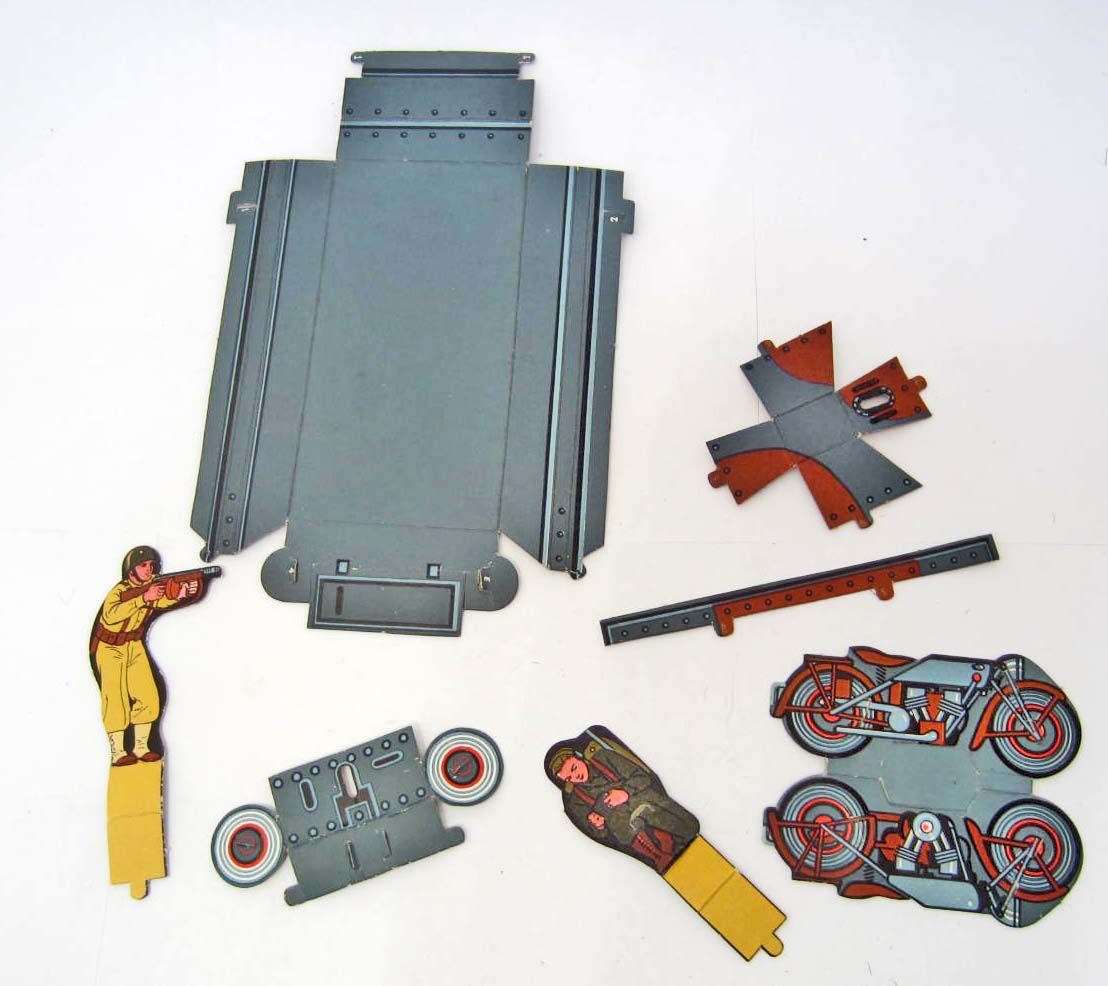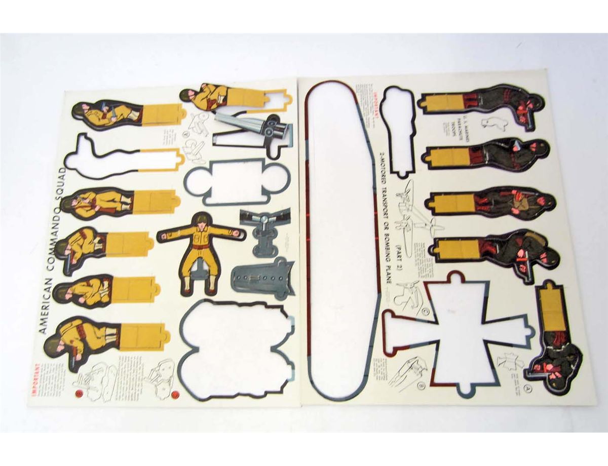 Set measures approx 14" x11" x 1". Figures are stiff cardboard and when put together measure approx 3" tall. Comes with lots of soldiers, tank, motorcycle and other army pieces. Missing Motor transport or Bombing Plane (you can make either One (1) with the parts.) and a few small parts. All soldiers included.