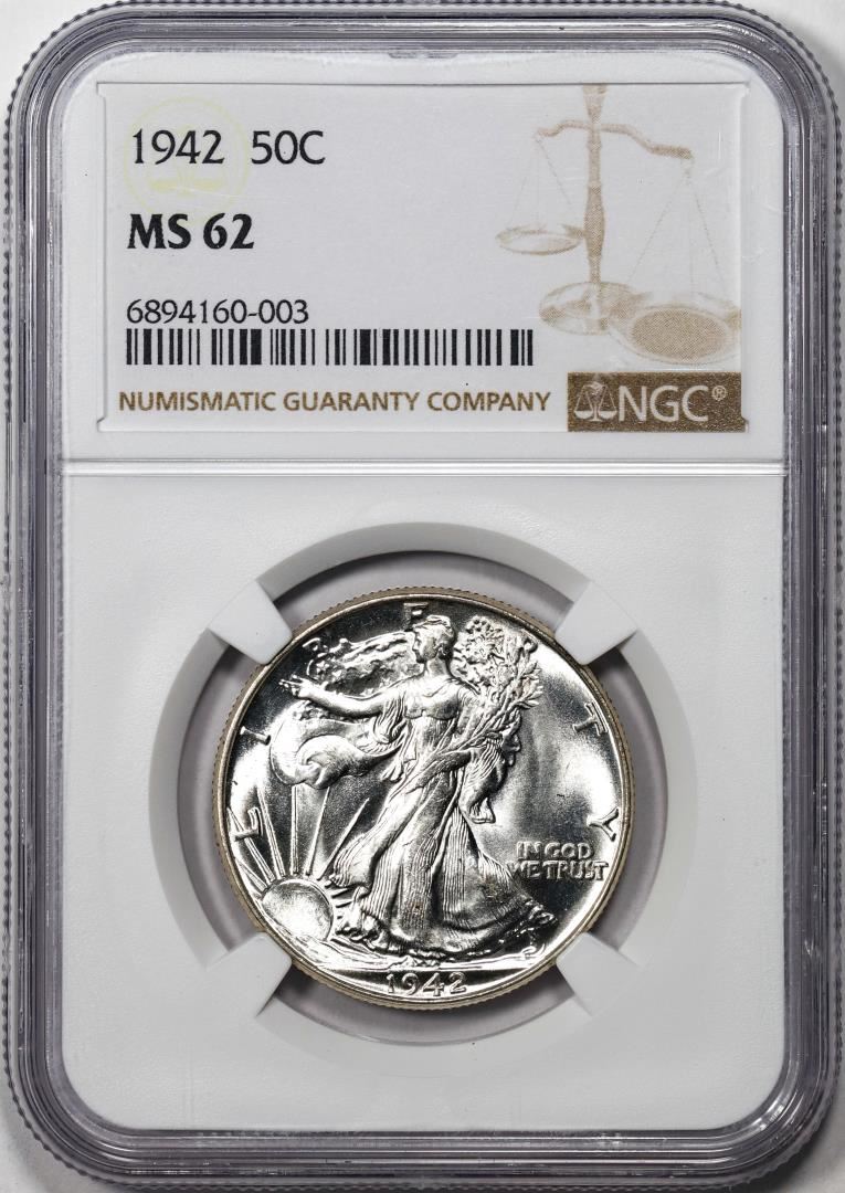 One 1942 Walking Liberty Half Dollar Coin NGC MS62. NGC Certified.