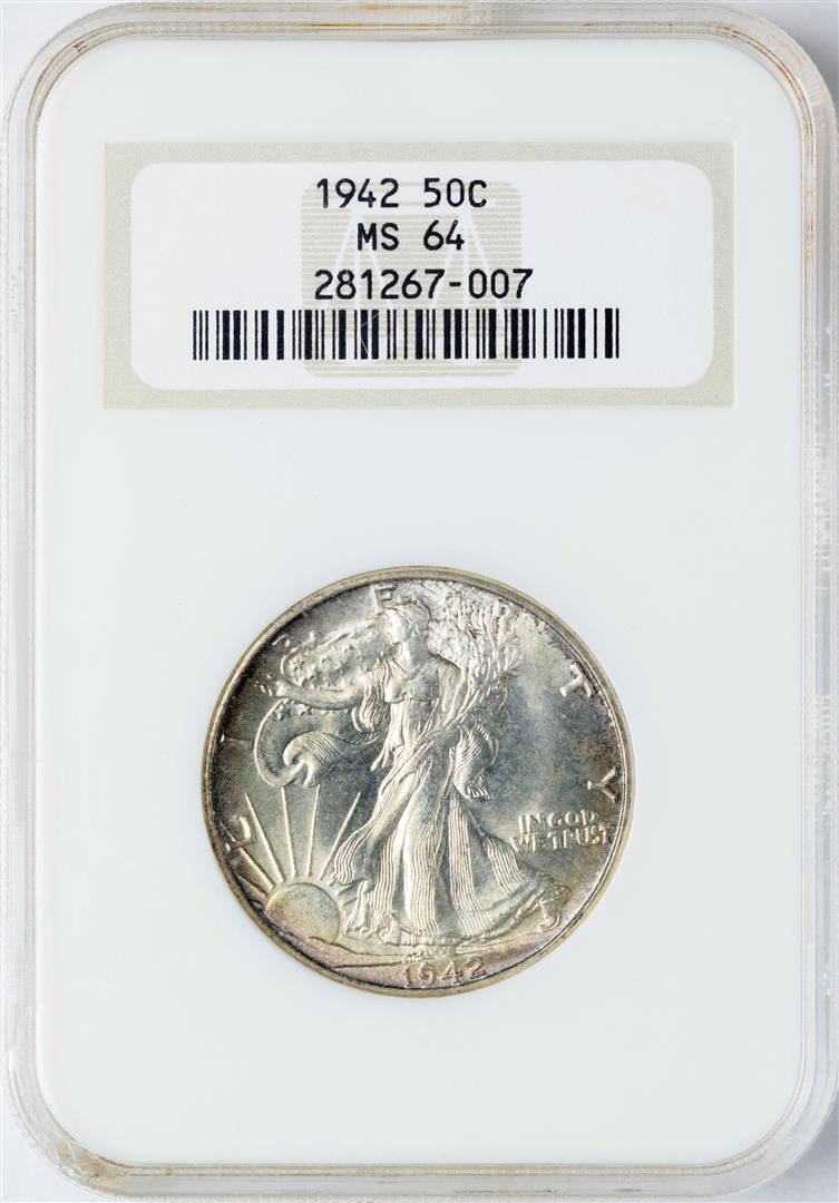 One 1942 Walking Liberty Half Dollar Coin NGC MS64. NGC Certified.