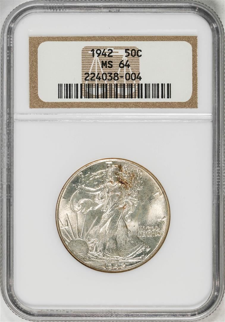 One 1942 Walking Liberty Half Dollar Coin NGC MS64. NGC Certified.