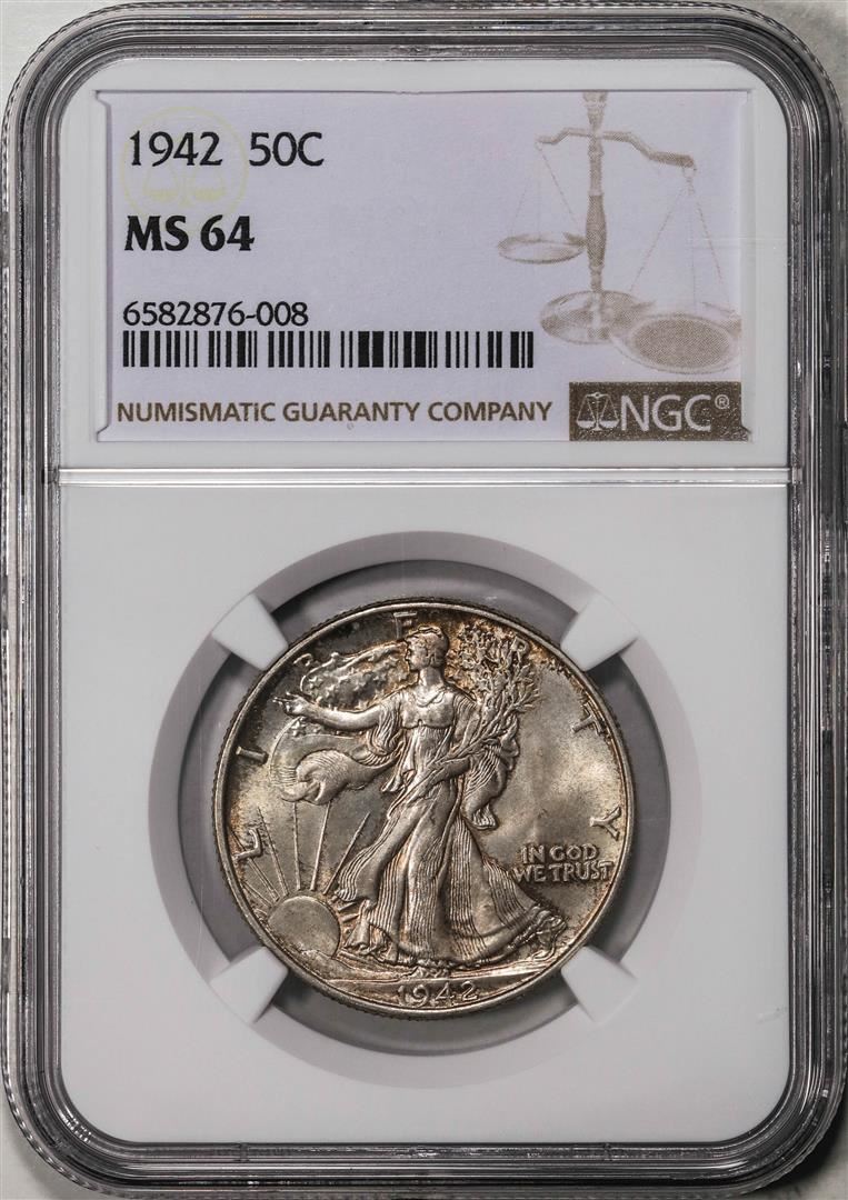 One 1942 Walking Liberty Half Dollar Coin NGC MS64. NGC Certified.