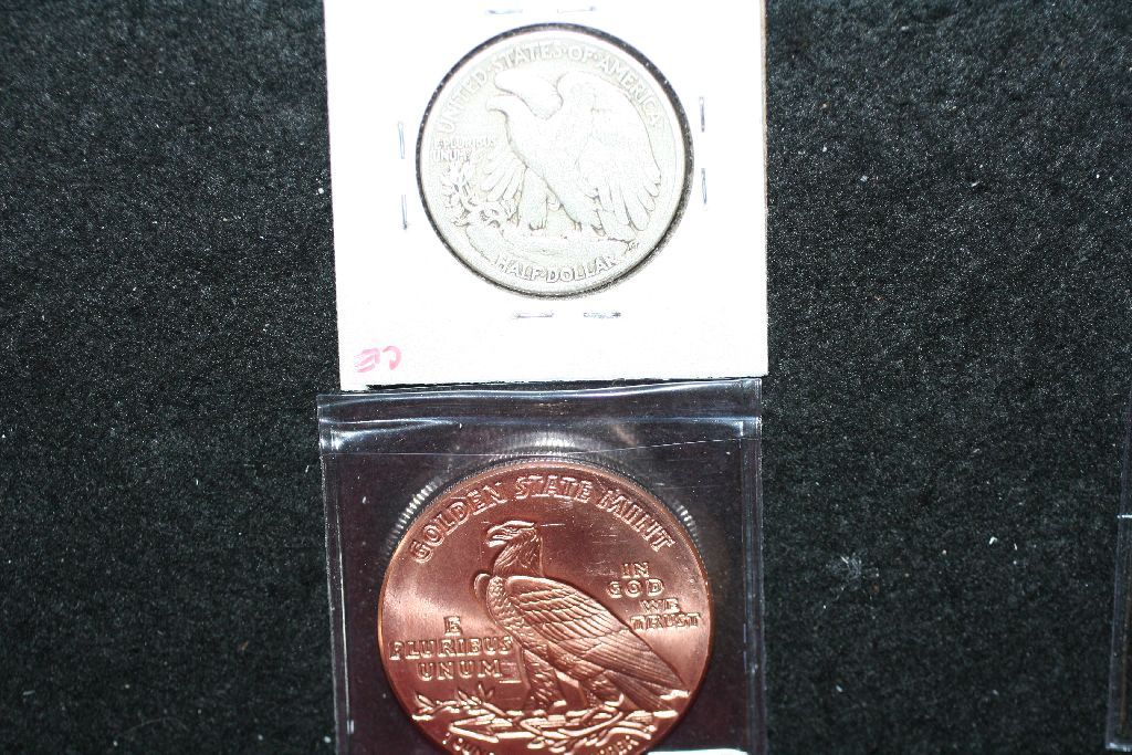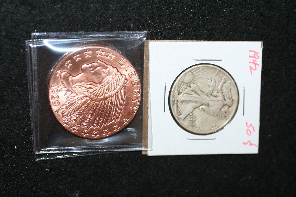 1942 Walking Liberty Half Dollar & Golden State Mint Copper Round; .999 Fine Copper 1 Oz.; Lot of 2