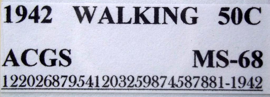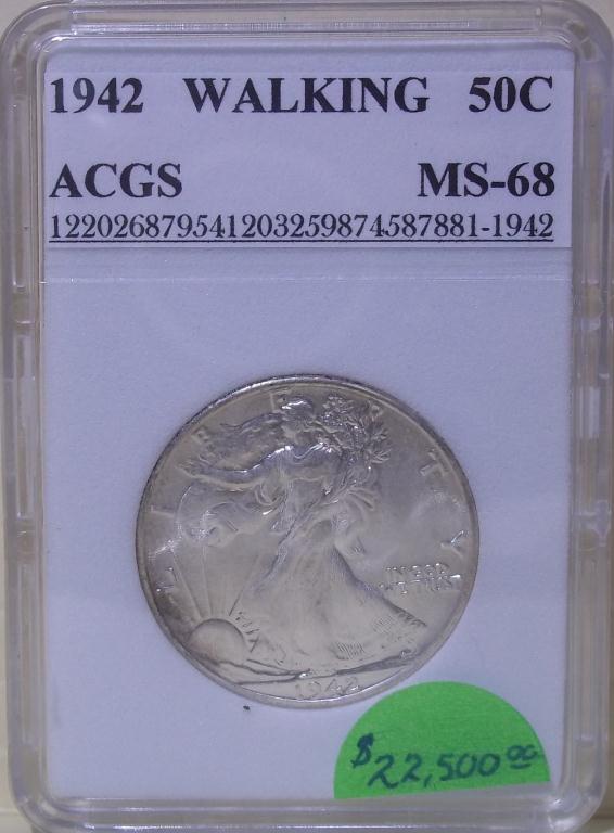 Astounding 1942 Philadelphia Mint Walking Liberty Half Dollar, certified and graded Mint State 68 by ACGS! Walkers are one of the HOTTEST coins in the collector market today, and coins in the higher end Mint State grades are ON FIRE!! Put this beauty away and watch you investment grow, and grow, and grow!!