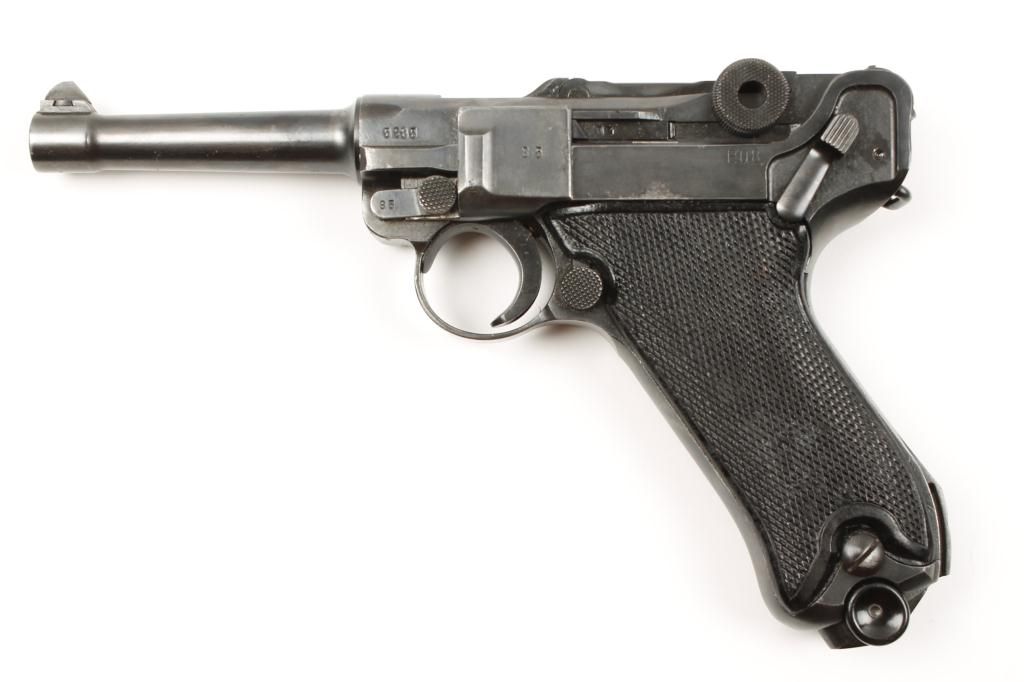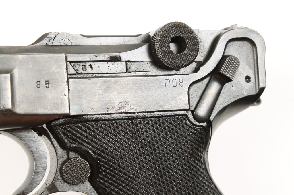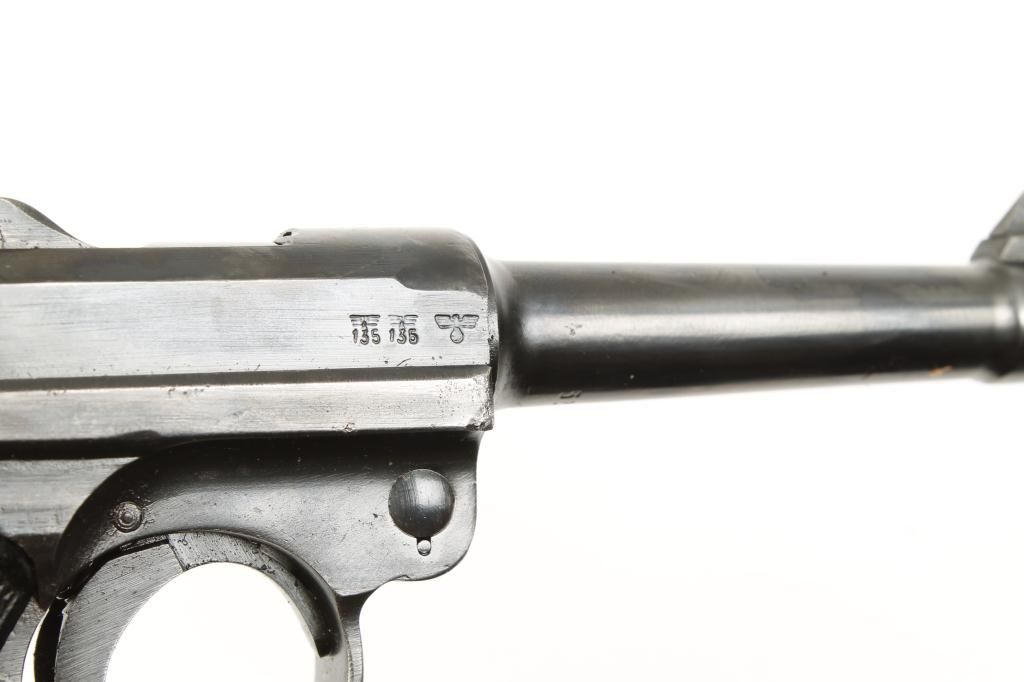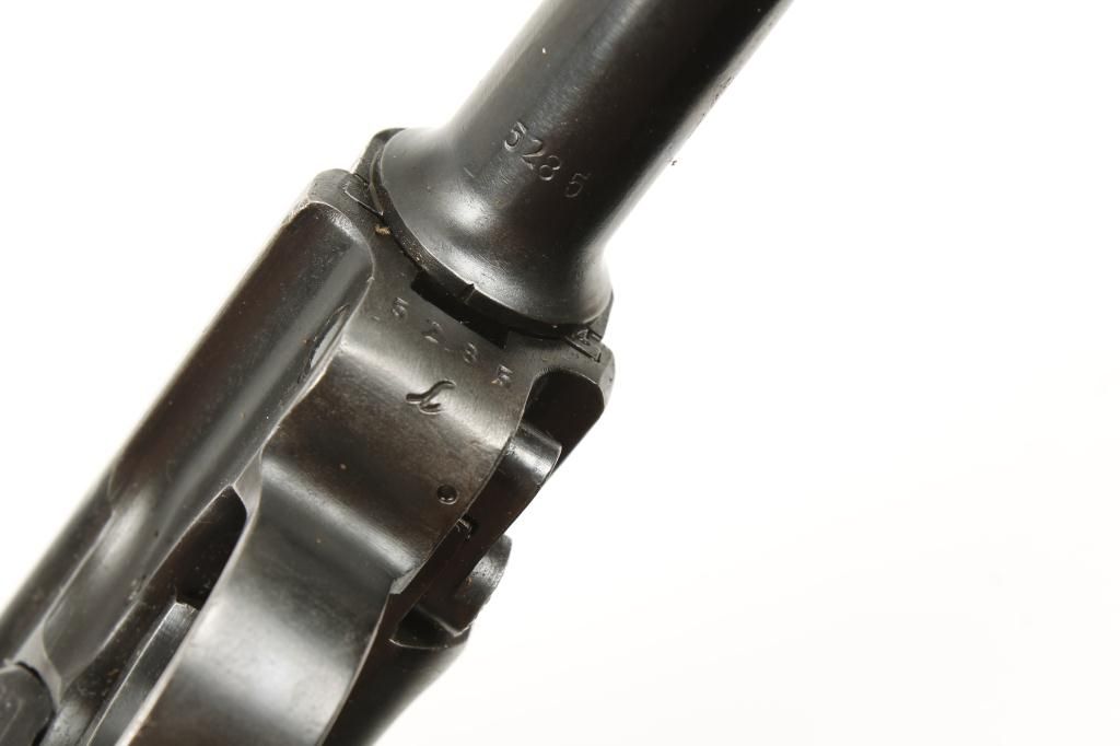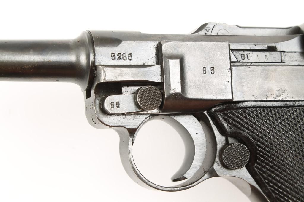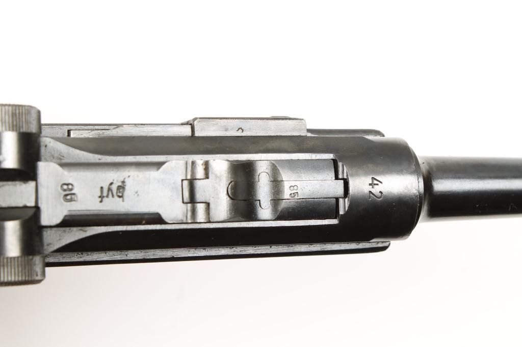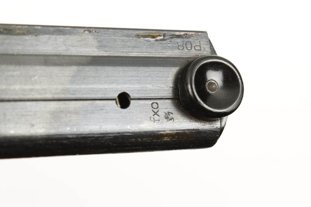 1942 dated Black Widow Luger by Mauser with BYF code on toggle, 9 mm caliber, black composite checkered grips, serial number 5285 with 1941 dated Nazi proofed Luger holster. The Luger shows 70% to 80% dulling bluefinish with some drifting and minor pitting. The grips show some dings, mars and scratches. All matching visible serial numbers with good Nazi inspections on the frame and barrel. The Luger retains correctblack bottom clip with PO.8 markings and FX code with Eagle proofs. The bore is good and the holster is good to very good with visible Eagle proof makers and makers code CTU. 41 and barely visible PO.8 marking. Along withextra black bottom correct FXO mag and takedown tool. Est.: $800 -$1,600.