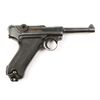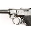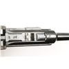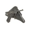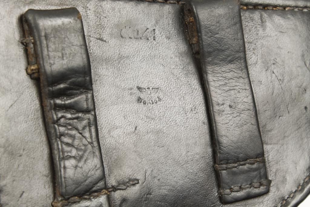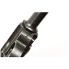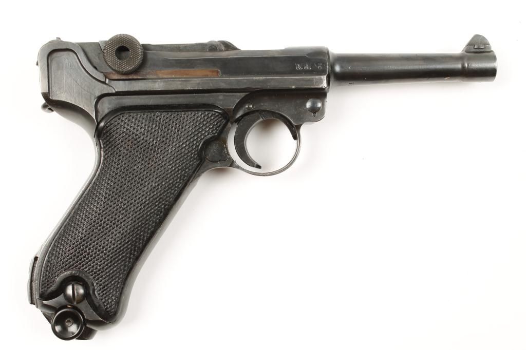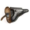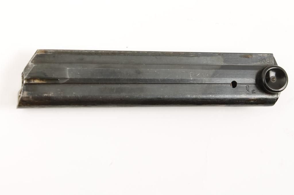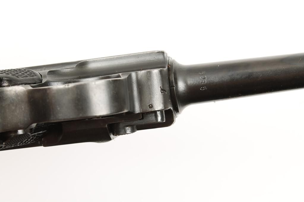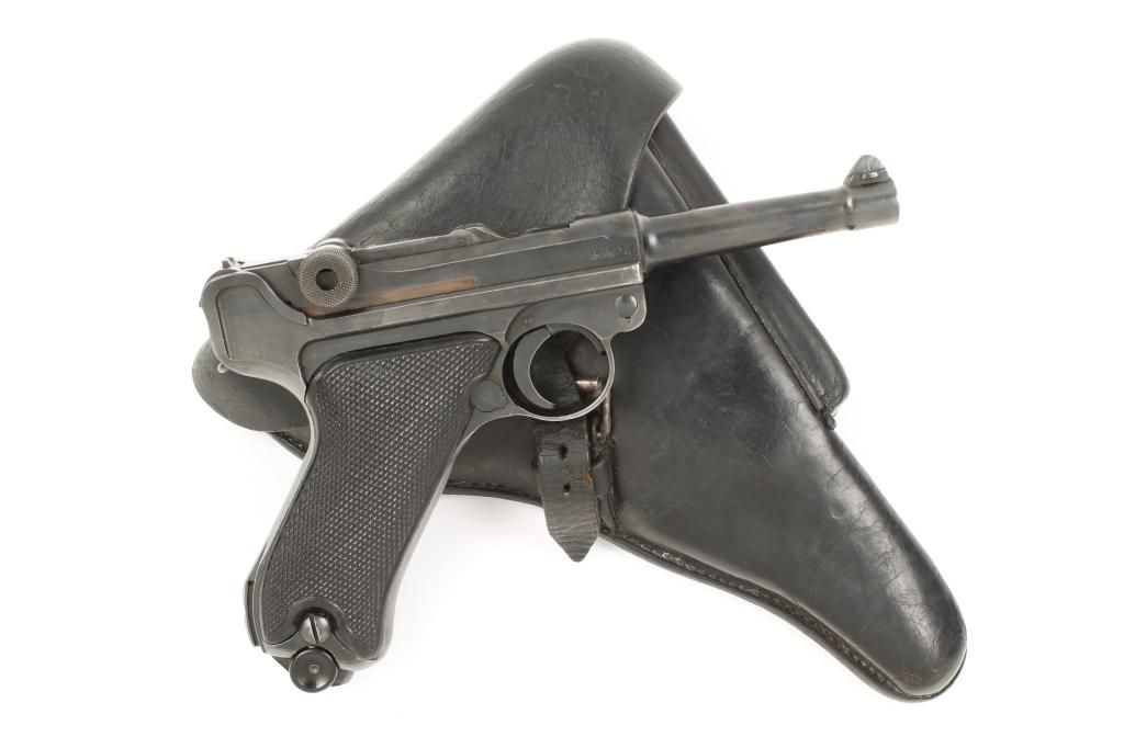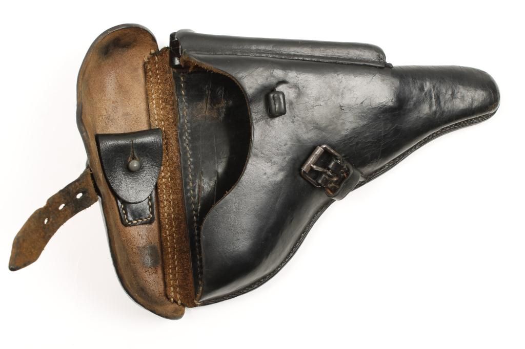 1942 dated Black Widow Luger by Mauser with BYF code on toggle, 9 mm caliber, black composite checkered grips, serial number 5285 with 1941 dated Nazi proofed Luger holster. The Luger shows 70% to 80% dulling bluefinish with some drifting and minor pitting. The grips show some dings, mars and scratches. All matching visible serial numbers with good Nazi inspections on the frame and barrel. The Luger retains correctblack bottom clip with PO.8 markings and FX code with Eagle proofs. The bore is good and the holster is good to very good with visible Eagle proof makers and makers code CTU. 41 and barely visible PO.8 marking. Along withextra black bottom correct FXO mag and takedown tool. Est.: $800 -$1,600.