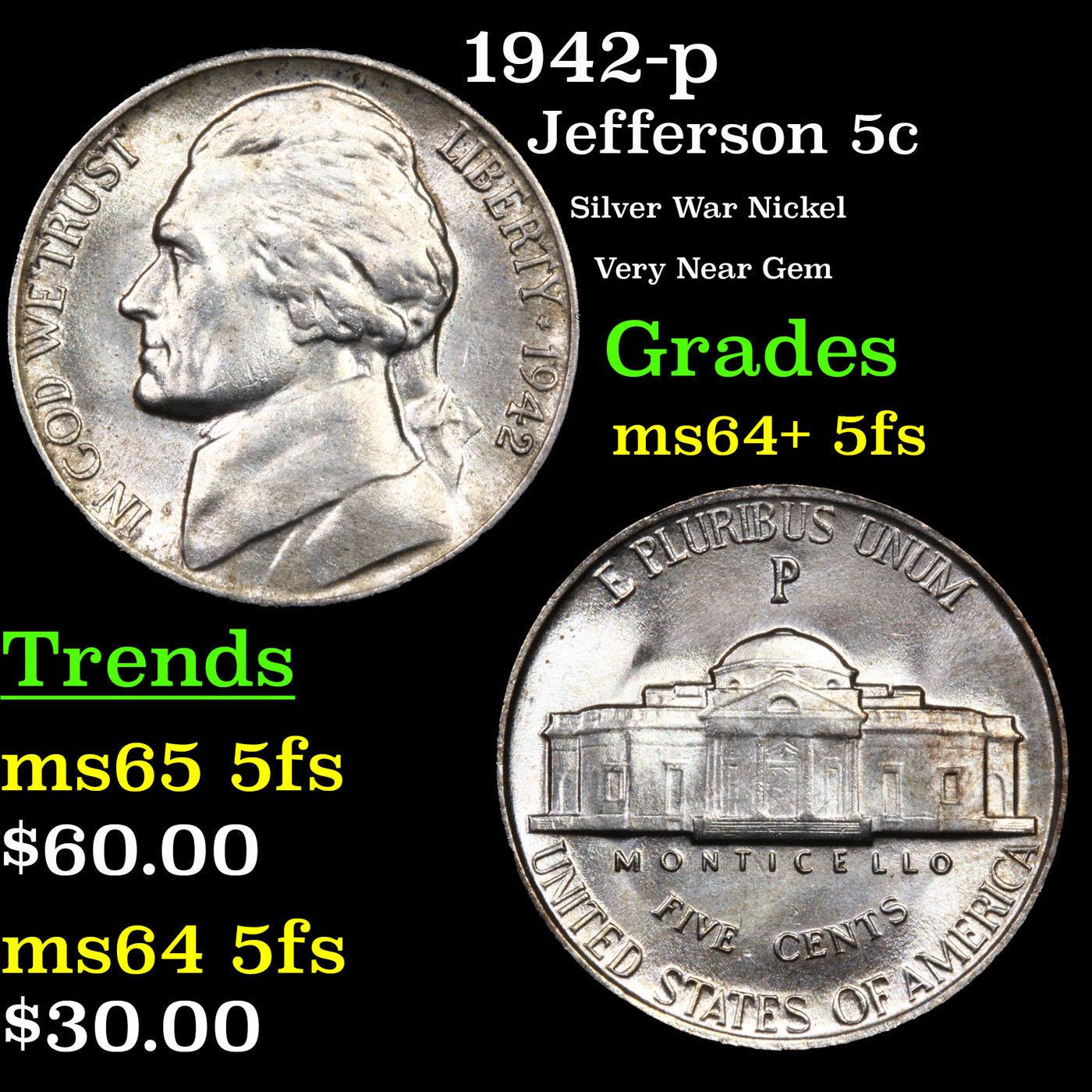 1942-p Jefferson Nickel 5c Grades Choice Unc+ 5fs.