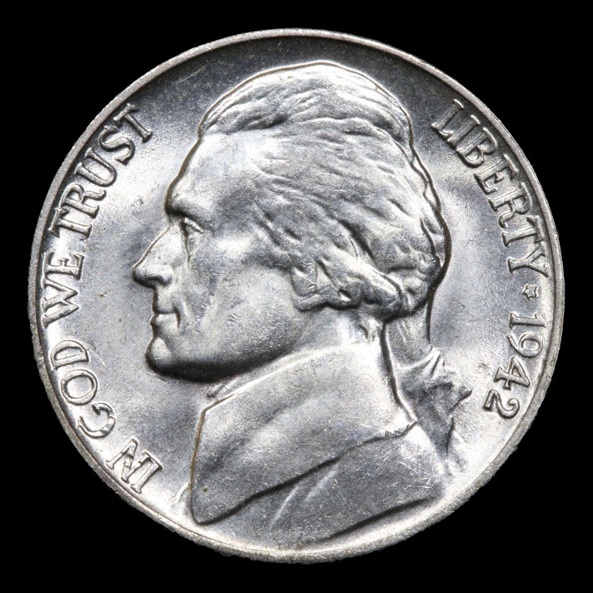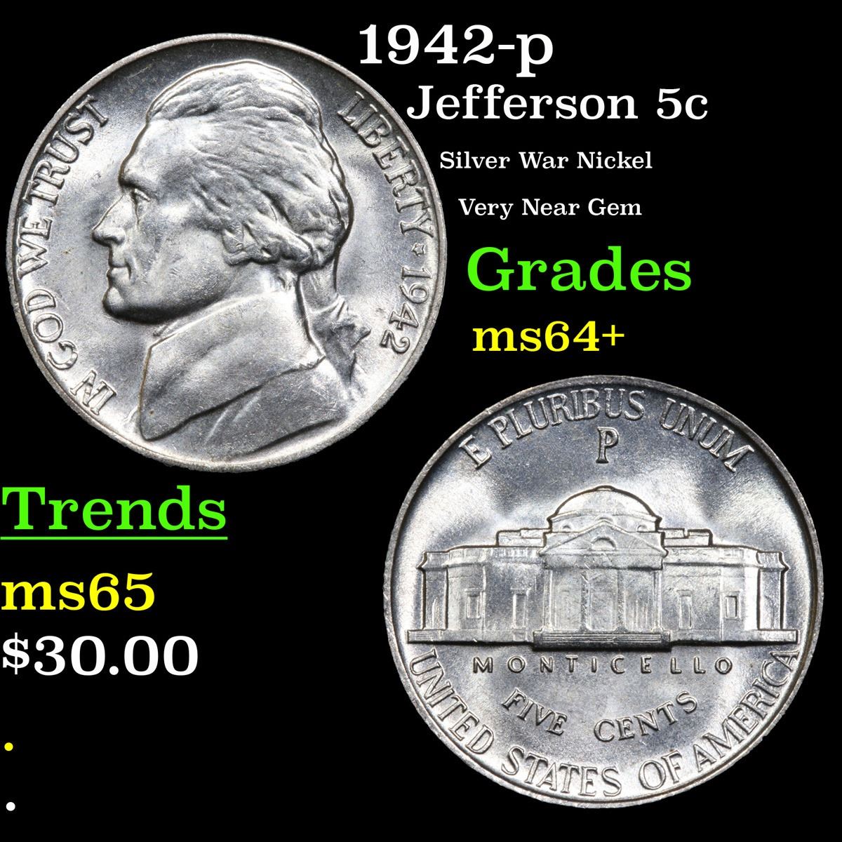 1942-p Silver War Nickel Very Near Gem Jefferson Nickel 5c Grades Choice+ Unc.