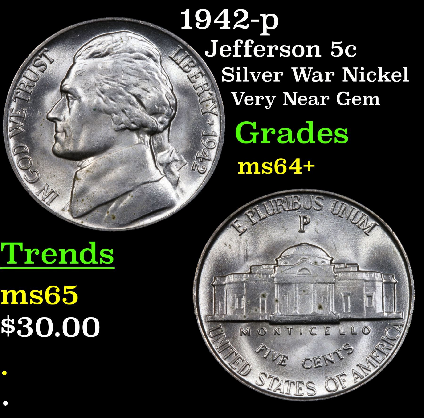 1942-p Jefferson Nickel 5c Grades Choice+ Unc.