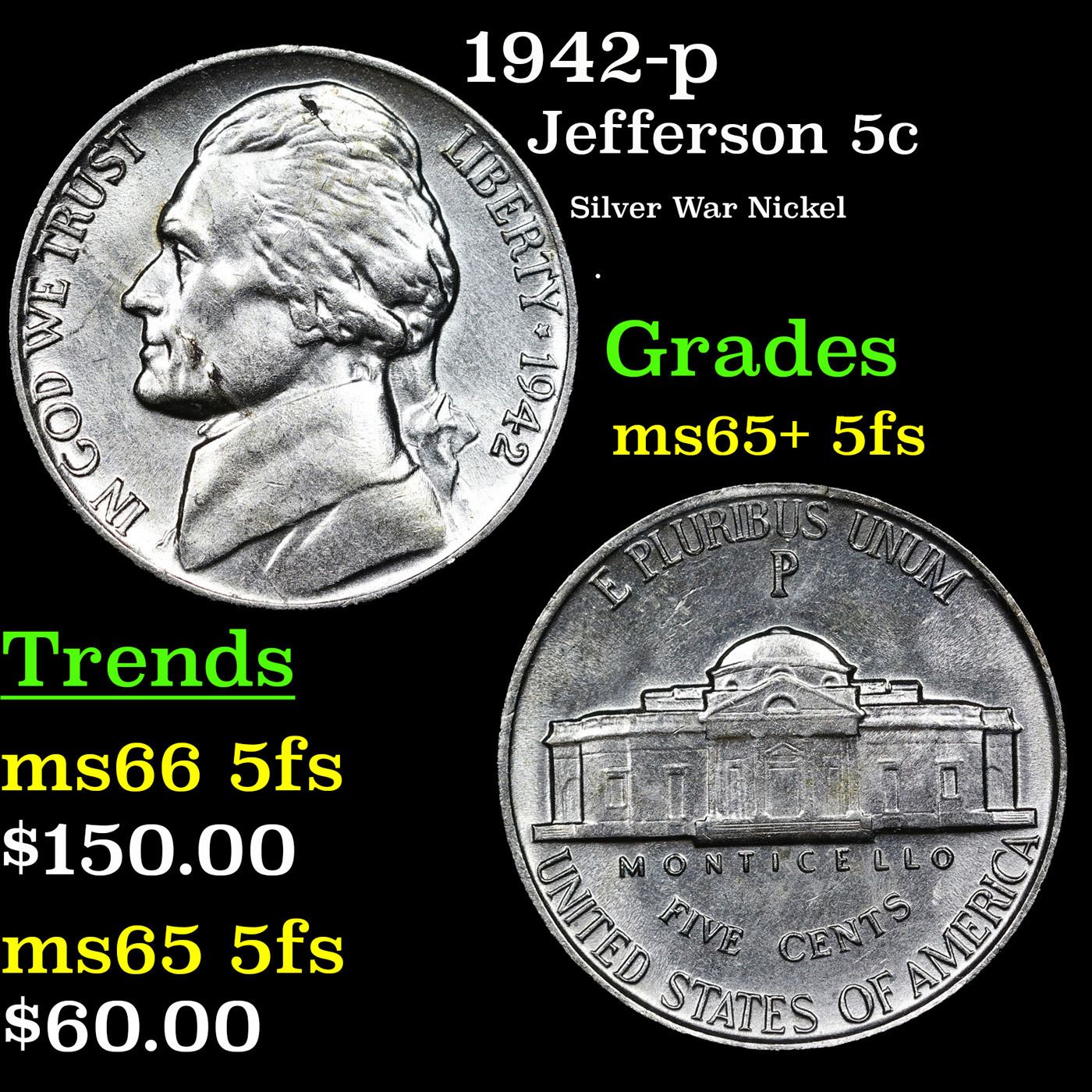 1942-p Jefferson Nickel 5c Grades GEM+ 5fs.