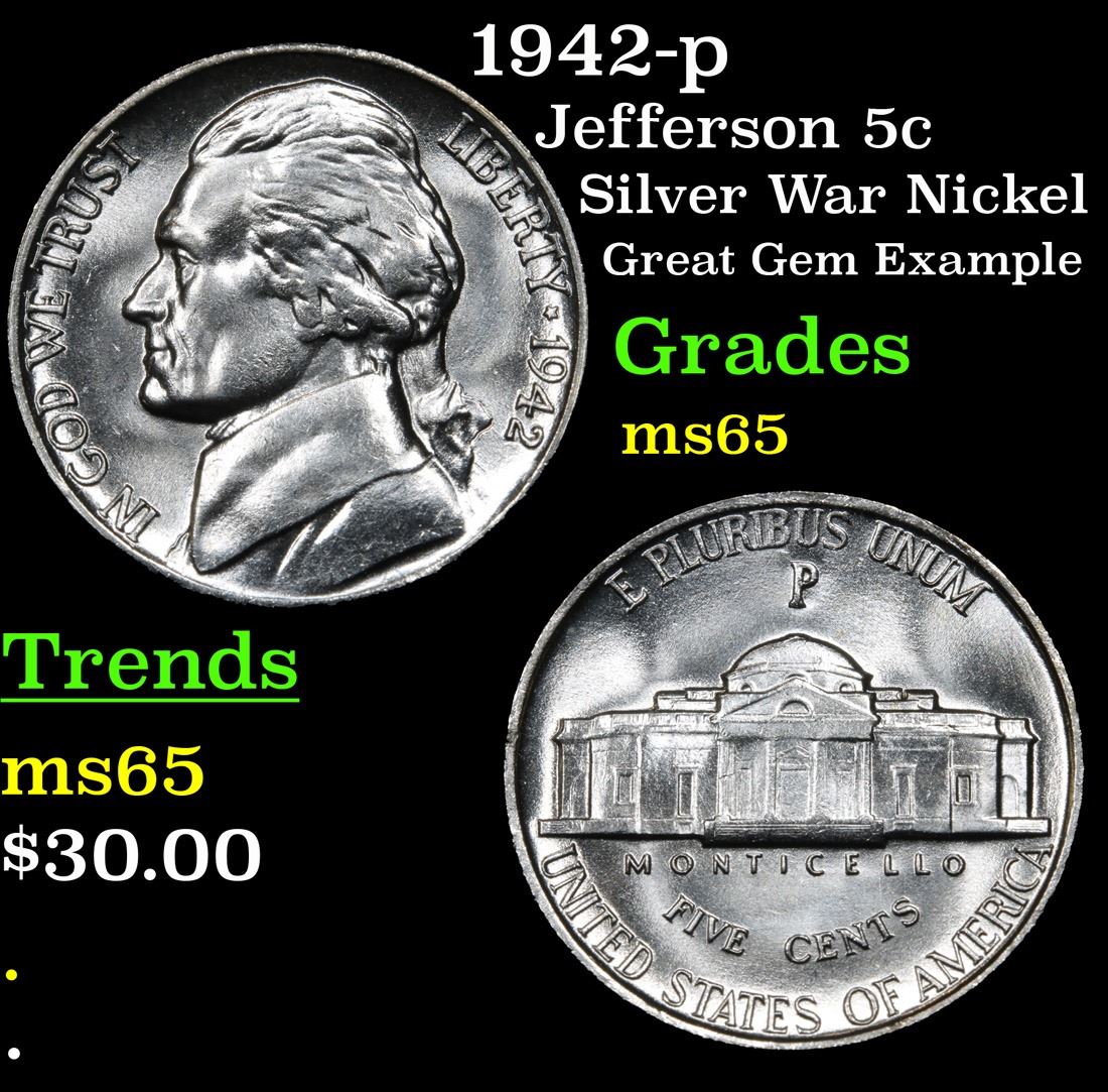 1942-p Silver War Nickel Great Gem Example Jefferson Nickel 5c Grades GEM Unc.