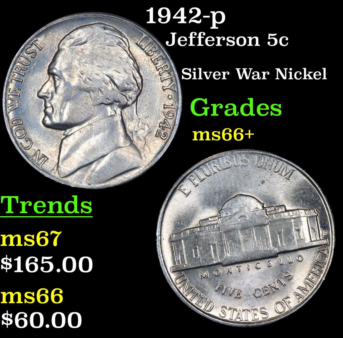 1942-p Silver War Nickel . Jefferson Nickel 5c Grades GEM++ Unc.