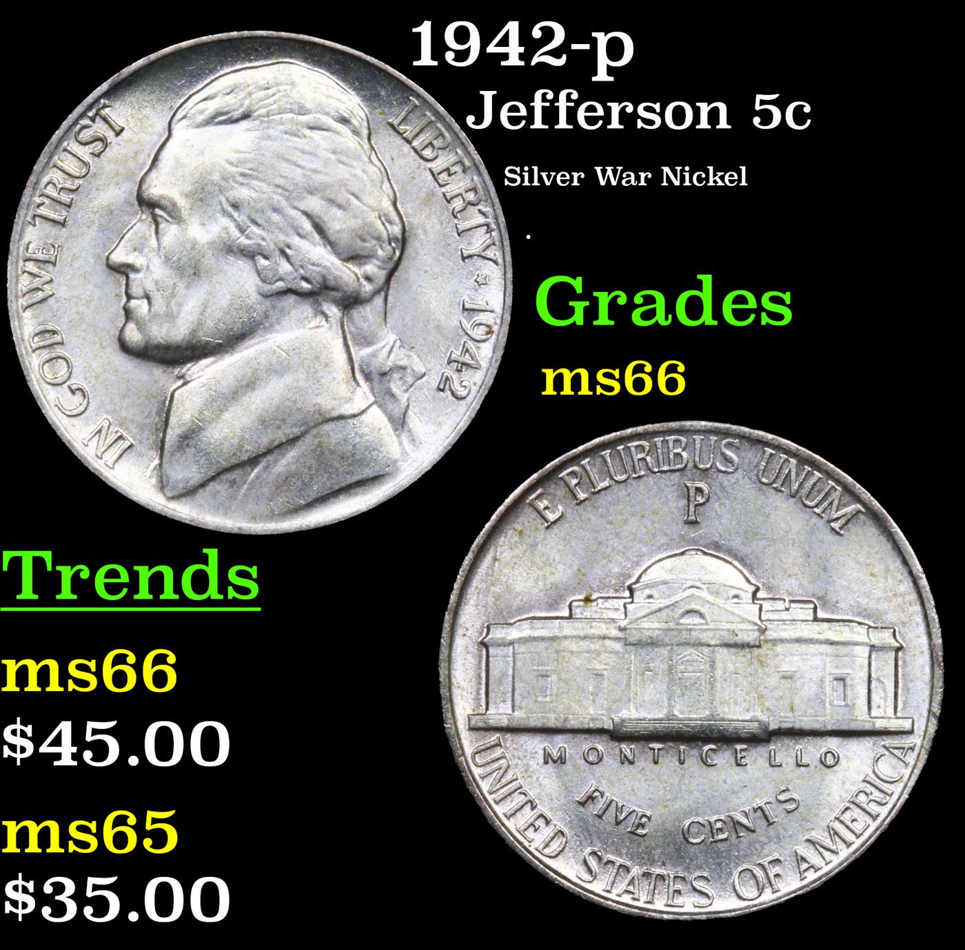 1942-p Jefferson Nickel 5c Grades GEM+ Unc.