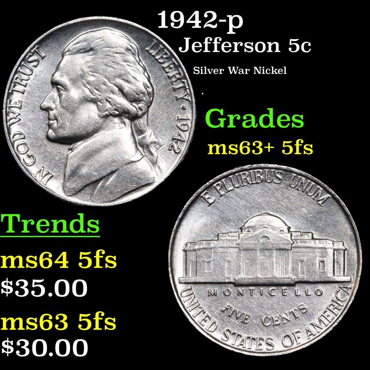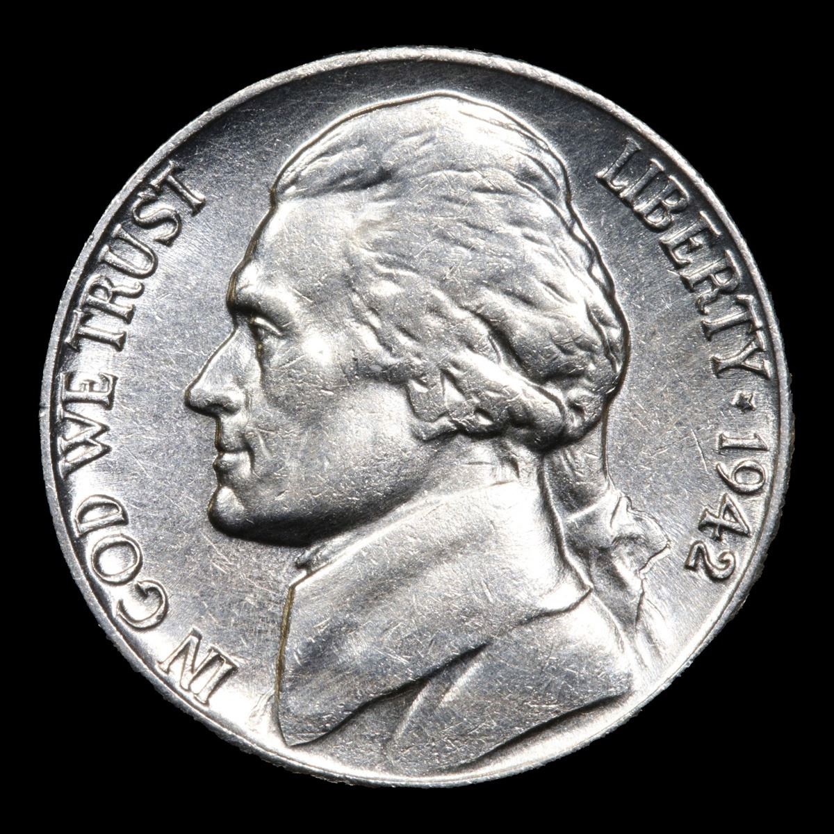1942-p Silver War Nickel . Jefferson Nickel 5c Grades Select Unc+ 5fs.