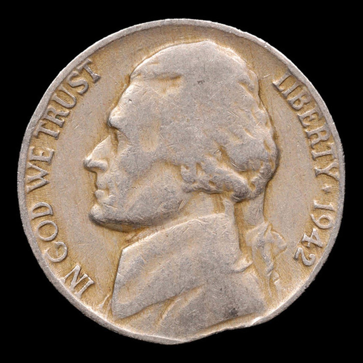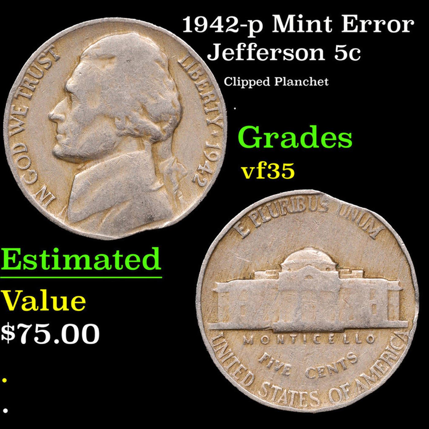 1942-p Mint Error Jefferson Nickel 5c Grades vf++.