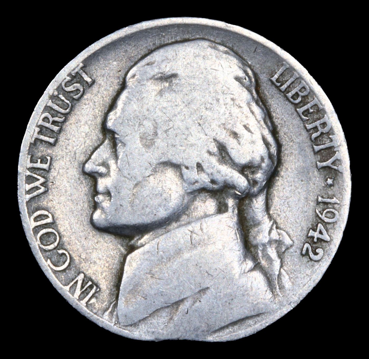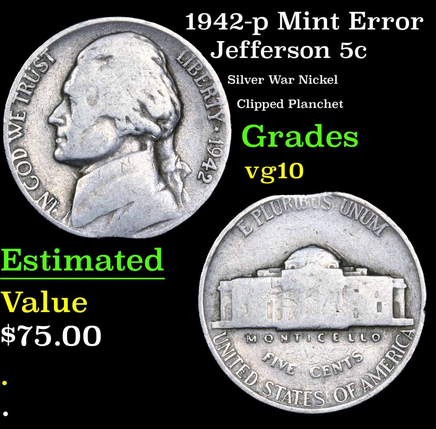 1942-p Mint Error Jefferson Nickel 5c Grades vg+.