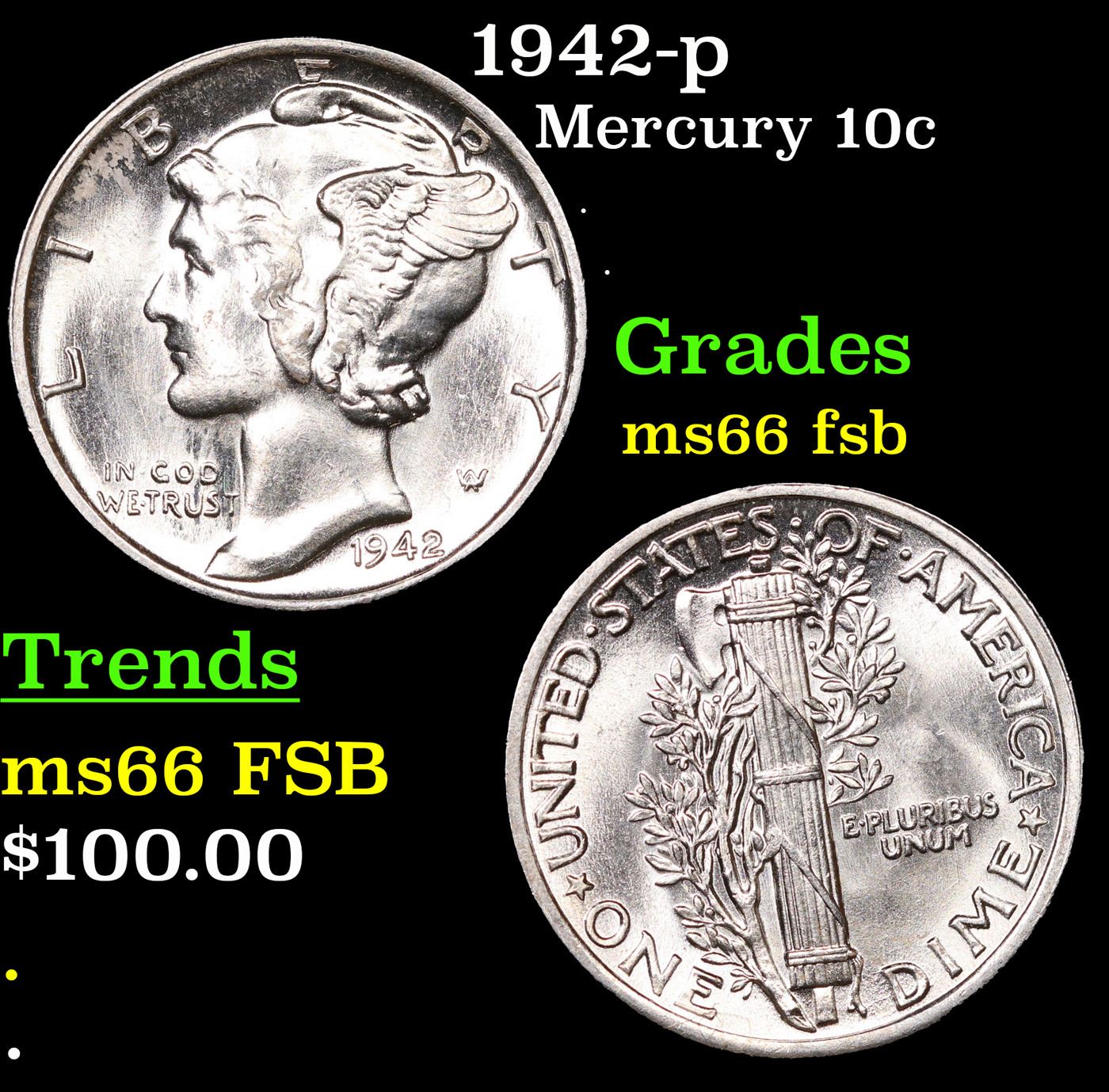 1942-p Mercury Dime 10c Grades GEM+ FSB.