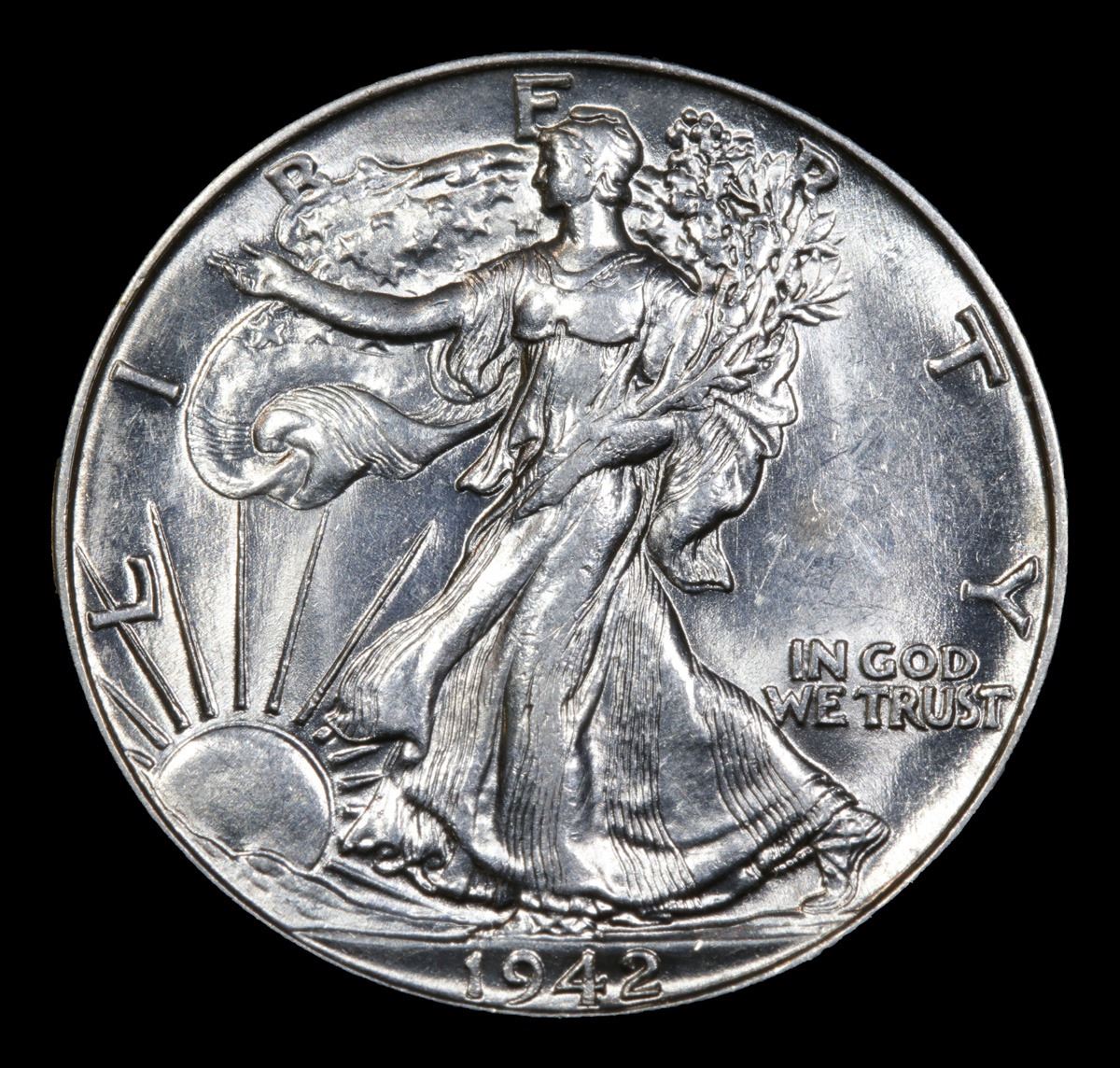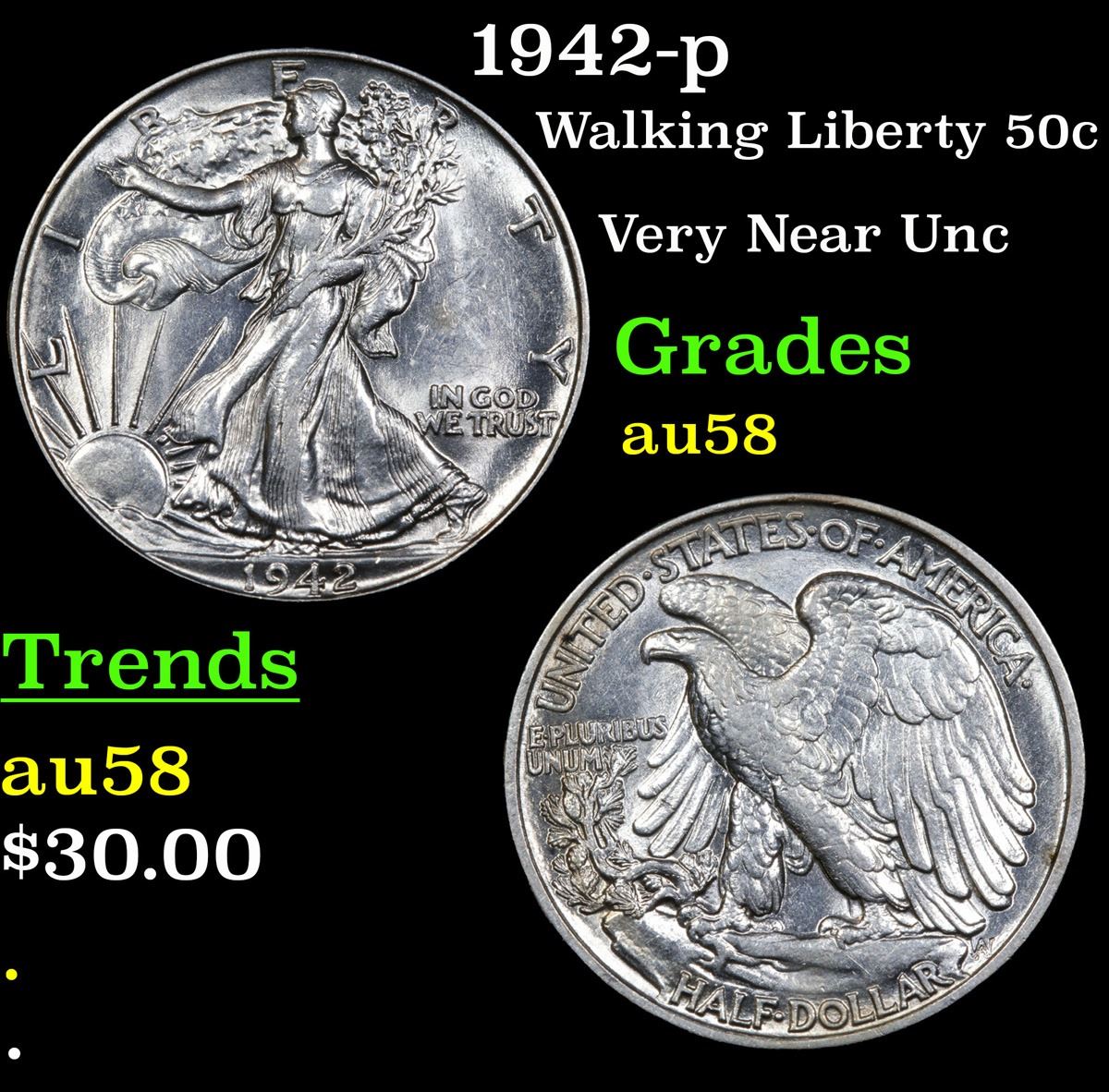 1942-p . Very Near Unc Walking Liberty Half Dollar 50c Grades Choice AU/BU Slider.