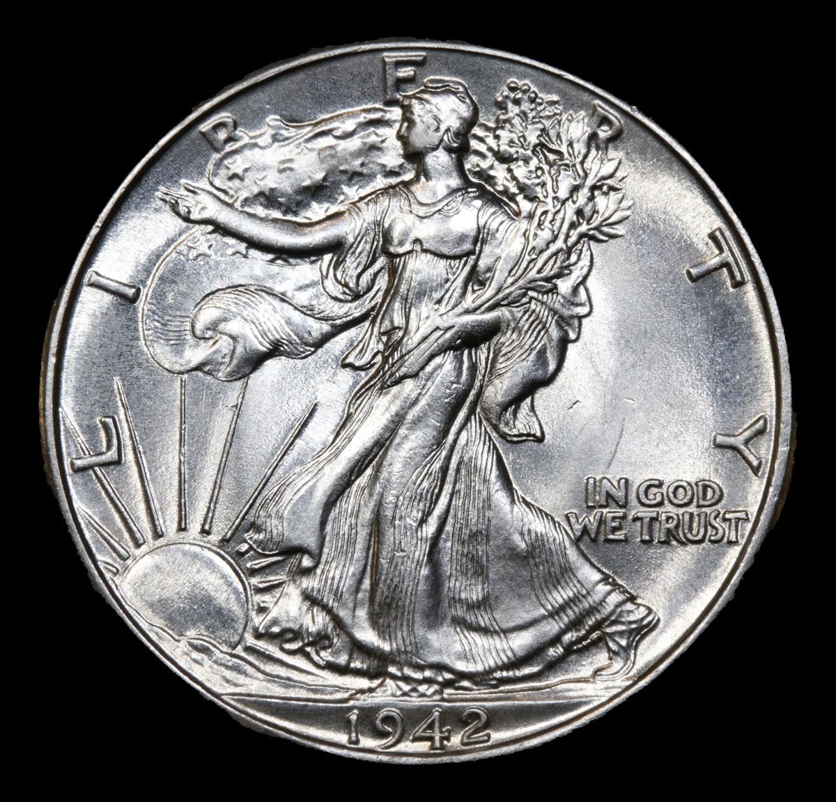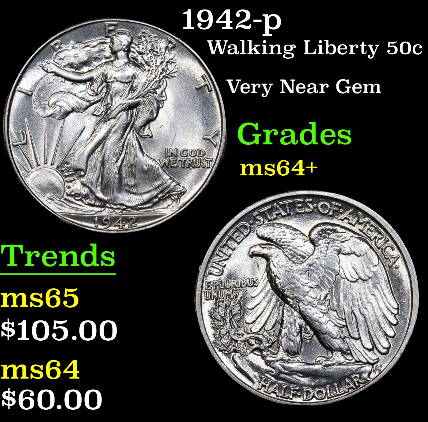 1942-p . Very Near Gem Walking Liberty Half Dollar 50c Grades Choice+ Unc.