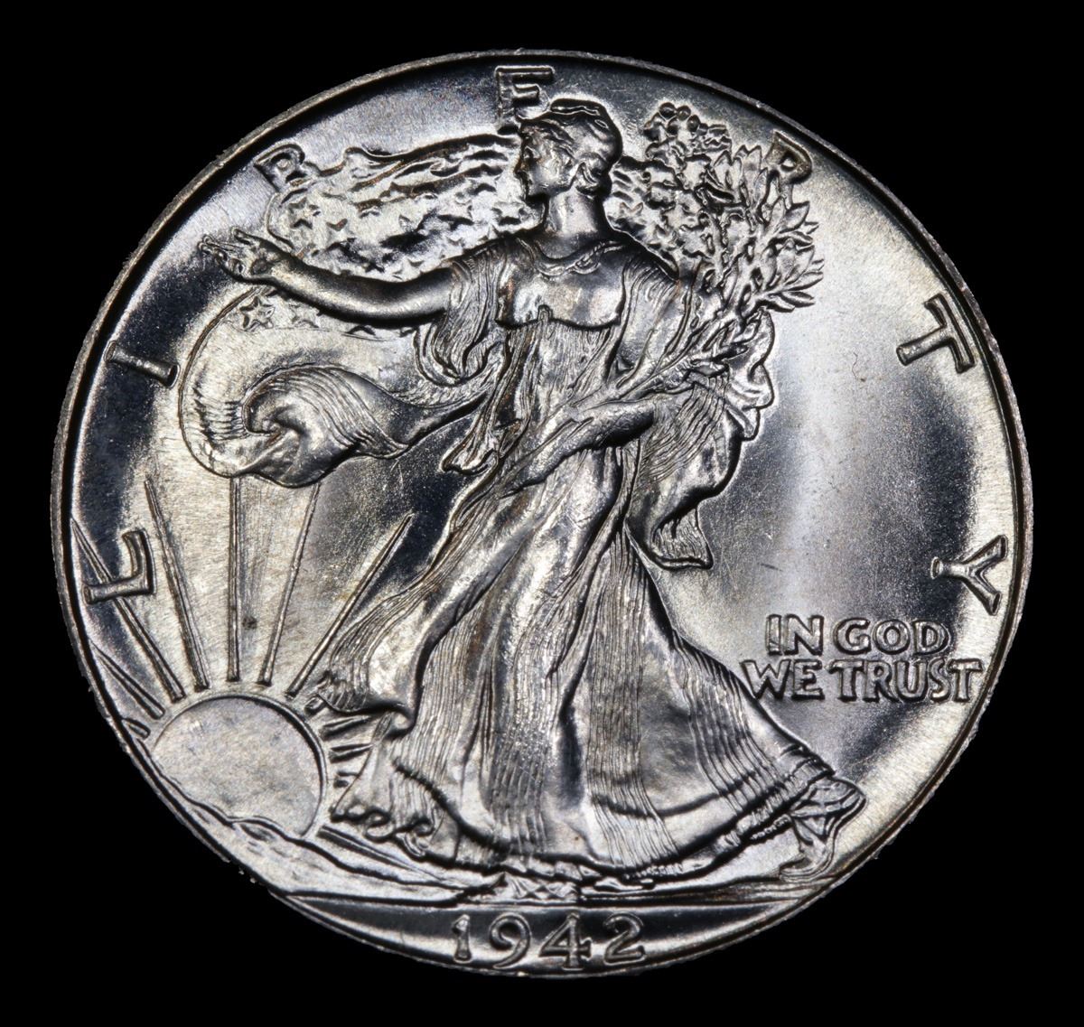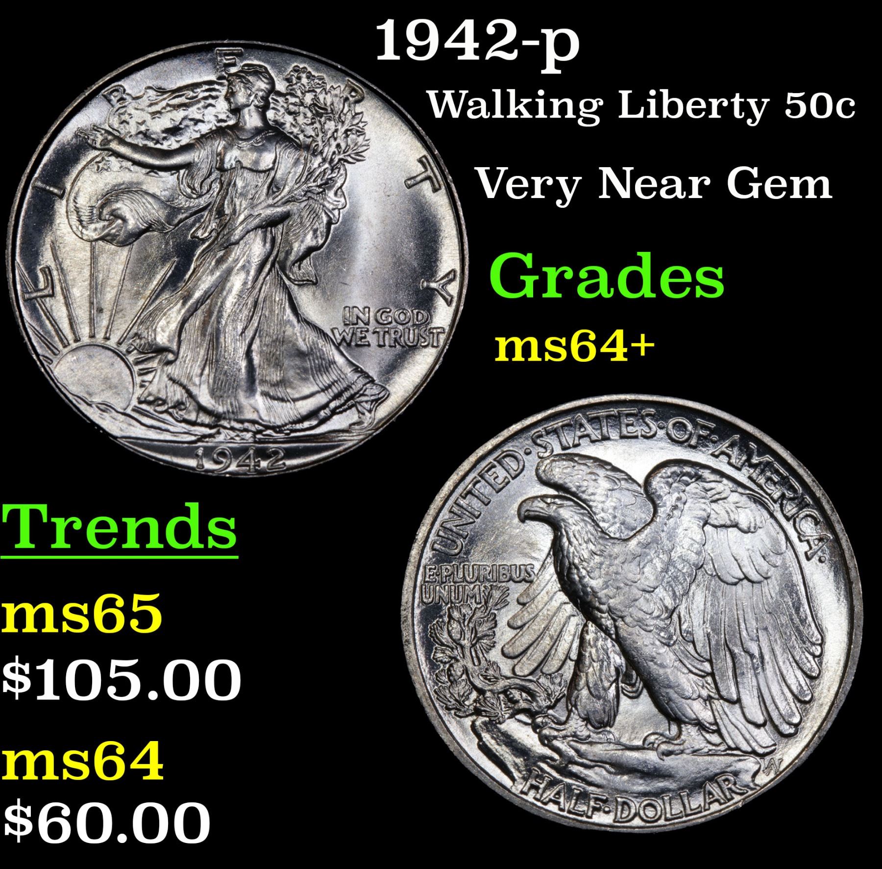 1942-p . Very Near Gem Walking Liberty Half Dollar 50c Grades Choice+ Unc.