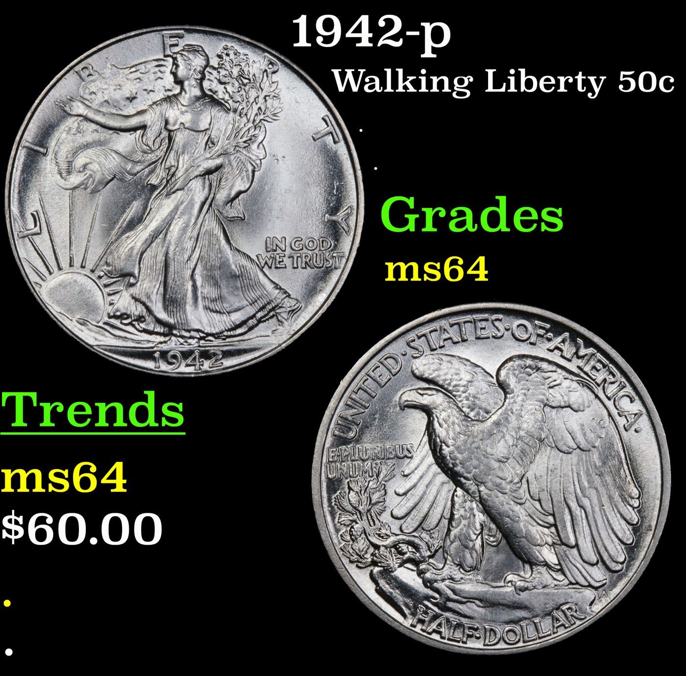 1942-p Walking Liberty Half Dollar 50c Grades Choice Unc.