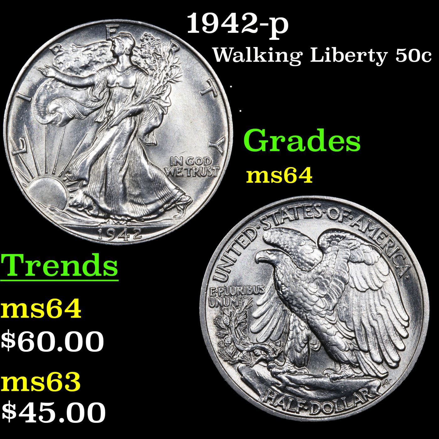 1942-p Walking Liberty Half Dollar 50c Grades Choice Unc.