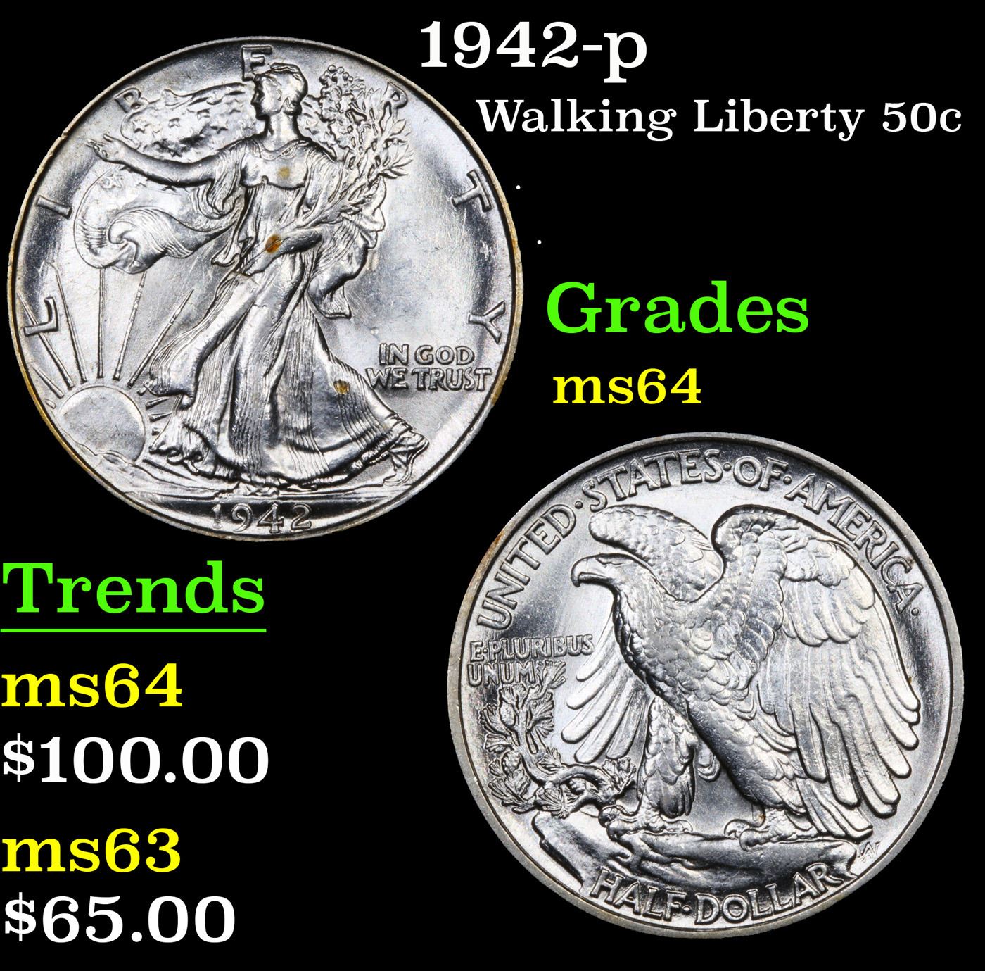 1942-p Walking Liberty Half Dollar 50c Grades Choice Unc.