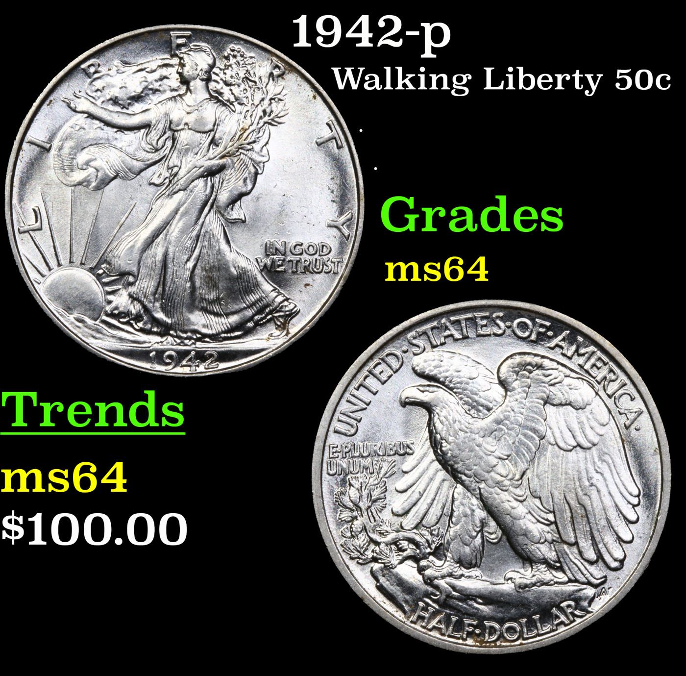 1942-p Walking Liberty Half Dollar 50c Grades Choice Unc.