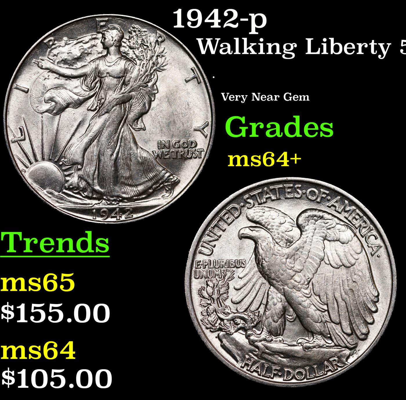 1942-p Walking Liberty Half Dollar 50c Grades Choice+ Unc.
