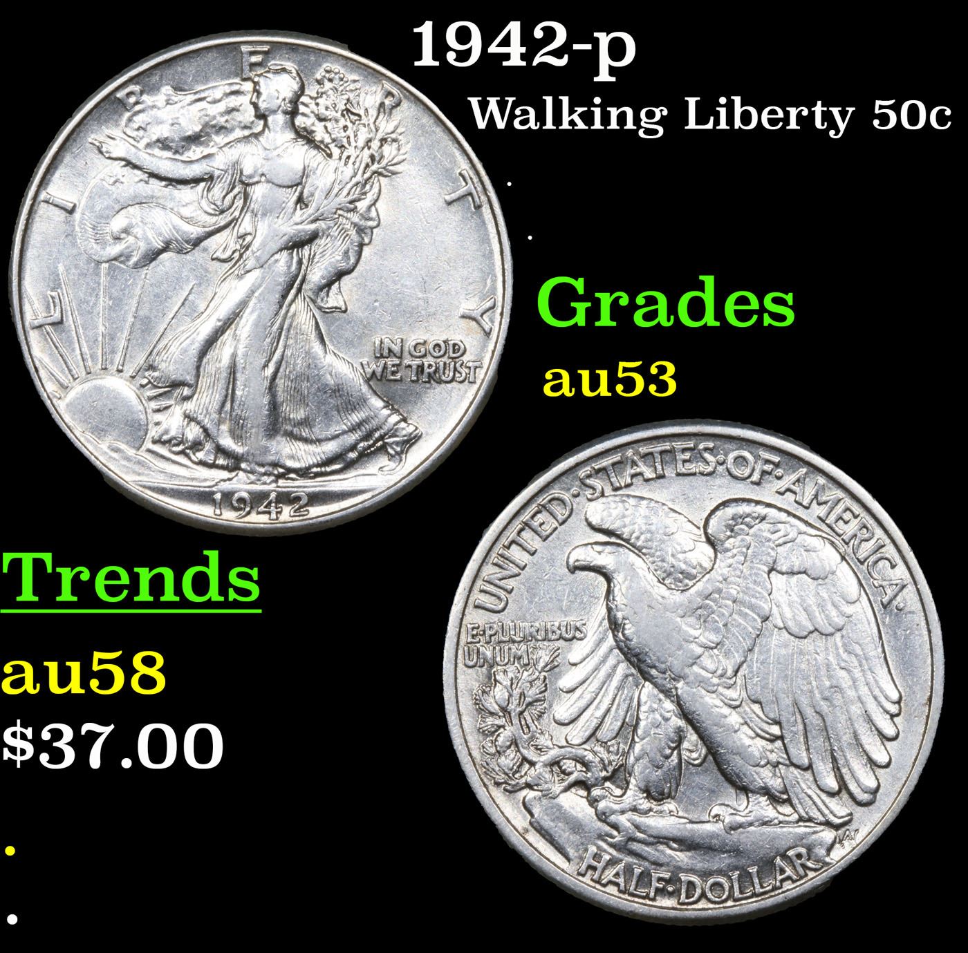 1942-p Walking Liberty Half Dollar 50c Grades Select AU.