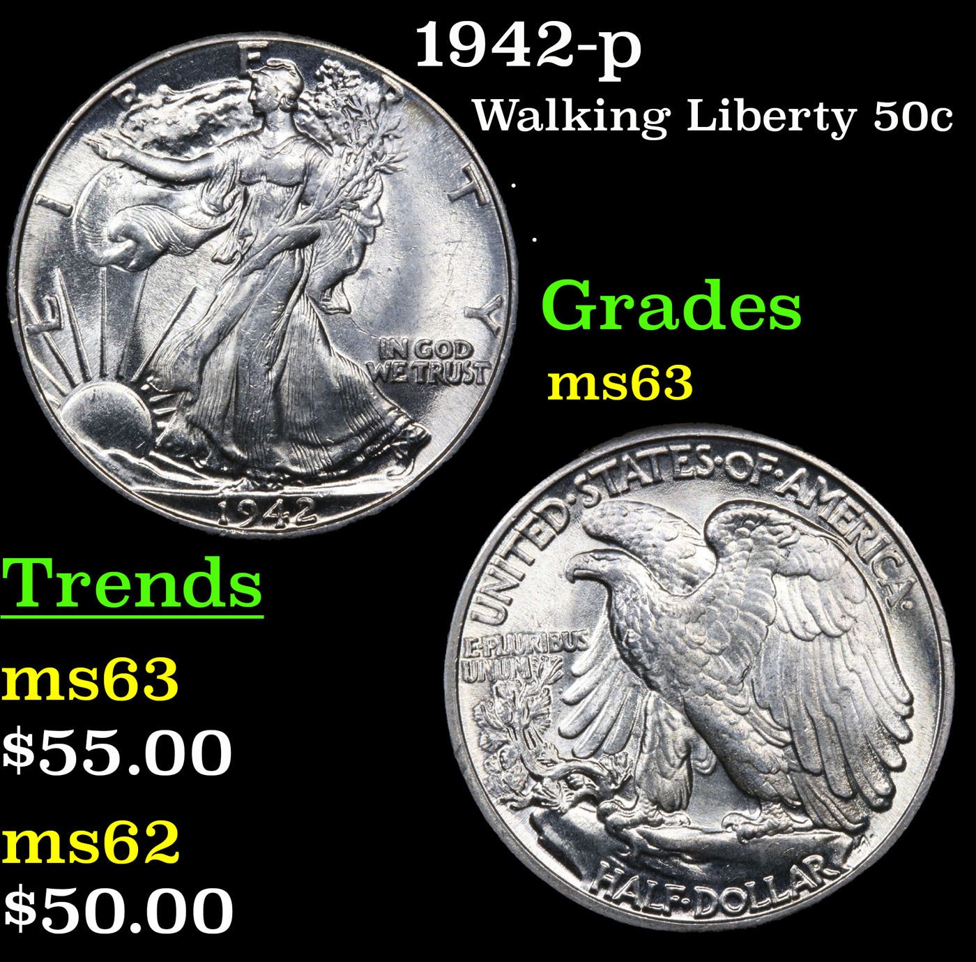 1942-p Walking Liberty Half Dollar 50c Grades Select Unc.