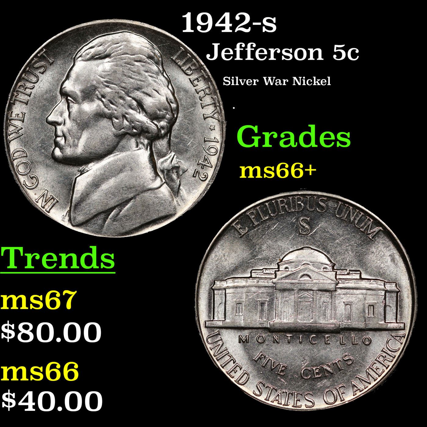 1942-s Jefferson Nickel 5c Grades GEM++ Unc.