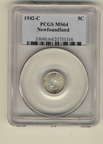 1942C Nfld 5¢ PCGS MS64. Full lustre.