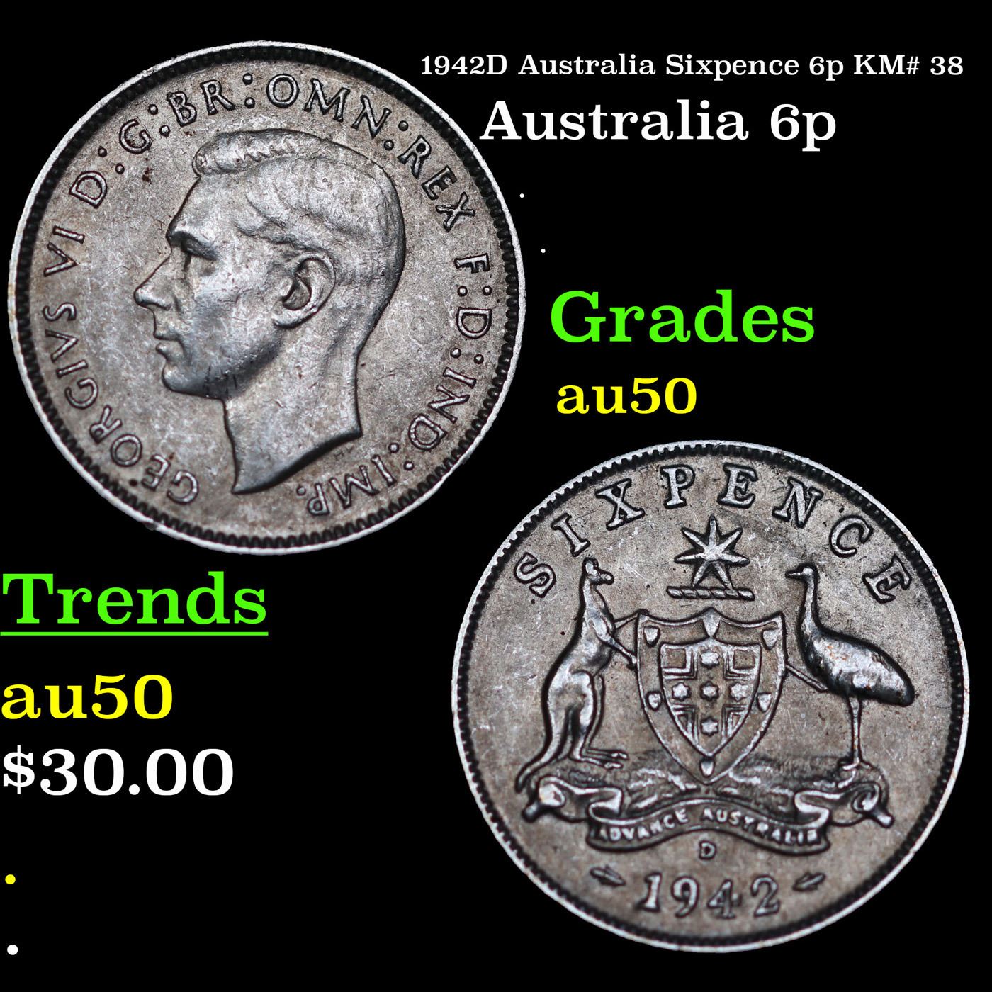 1942D Australia Sixpence 6p KM# 38 Grades AU, Almost Unc