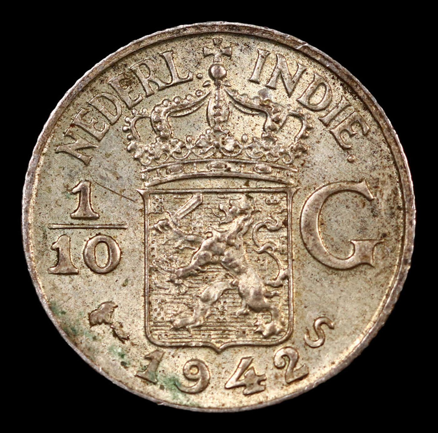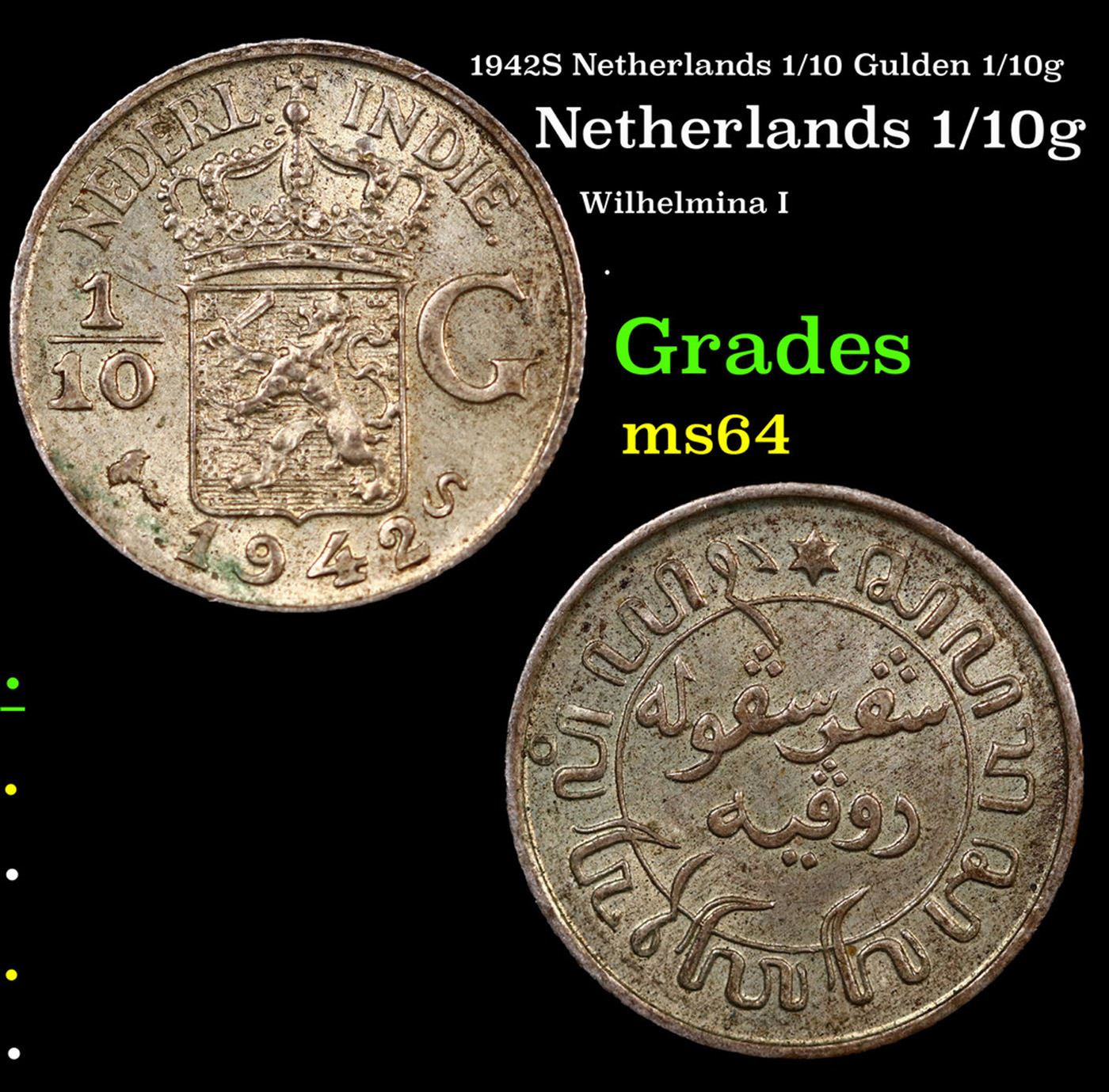 1942S Netherlands 1/10 Gulden 1/10g Grades Choice Unc. Wilhelmina (Wilhelmina Helena Pauline Maria; 31 August 1880 – 28 November 1962) was Queen of the Netherlands from 1890 until her abdication in 1948. She reigned for nearly 58 years, longer than any other Dutch monarch. Her reign saw both World War I and World War II, as well as the Dutch economic crisis of 1933.The only child of King William III of the Netherlands and Emma of Waldeck and Pyrmont, Wilhelmina ascended to the throne at the age of 10 after her father's death in 1890, under her mother's regency. After taking charge of government, Wilhelmina became generally popular for maintaining Dutch neutrality during the First World War and solving many of her country's industrial problems. By that time, her business ventures had made her the world's first female billionaire in dollars. She went on to ensure that her family was one of seven European royal houses remaining in existence.Following the German invasion of the Netherlands in 1940, Wilhelmina fled to Britain and took charge of the Dutch government-in-exile. She frequently spoke to the nation over radio and came to be regarded as a symbol of the resistance. By 1948, she had returned to the liberated Netherlands and was the only survivor of the 16 monarchs who were sitting on their thrones at the time of her coronation. Increasingly beset by poor health, Wilhelmina abdicated in favour of her daughter Juliana in September 1948 and retired to Het Loo Palace, where she died in 1962.She remains popular in the Netherlands, even among the Dutch Republican movement. This is due to her being seen as a symbol of Dutch Resistance during World War II.